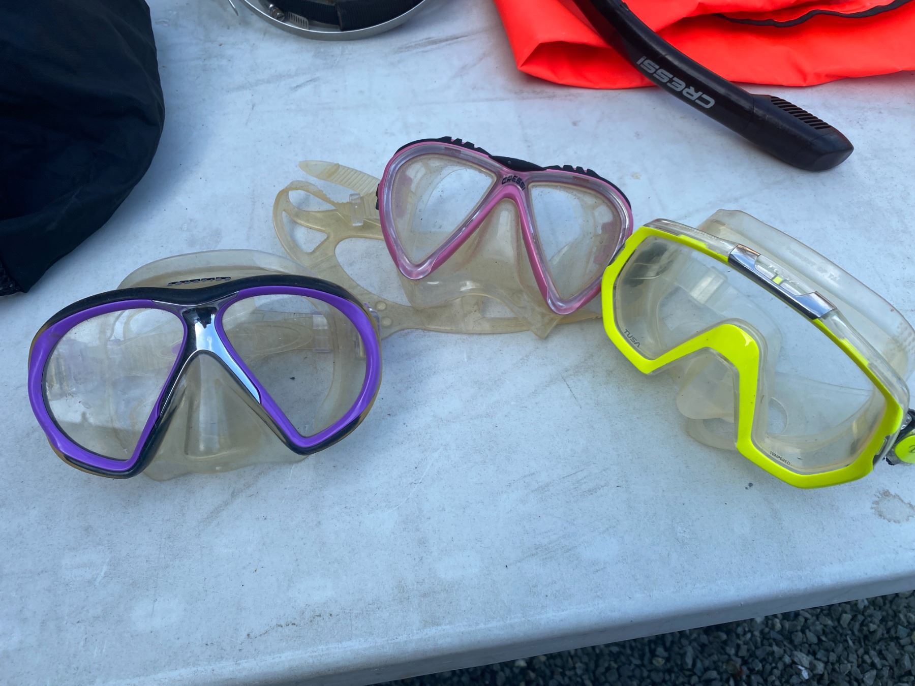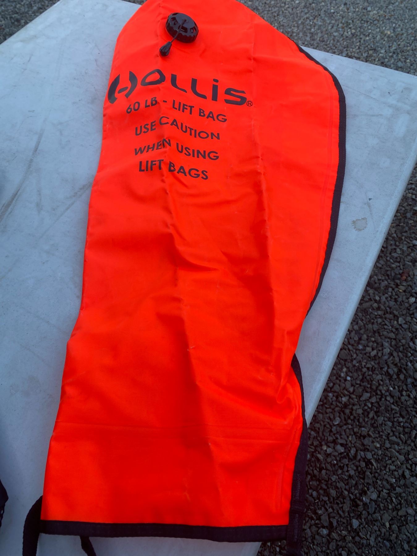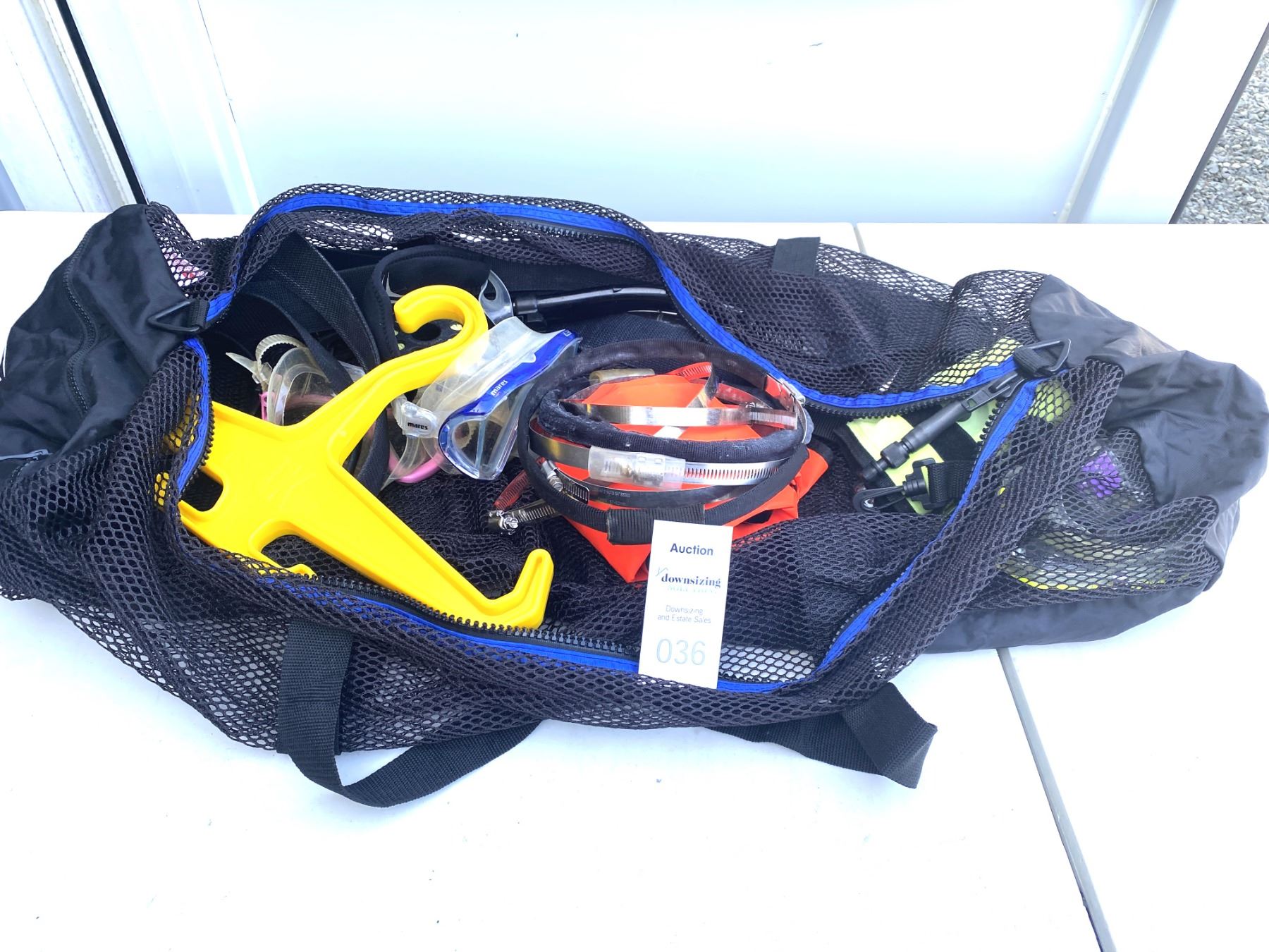 Mesh bag of assorted dive gear, Masks, Snorke, goggles, Two finger reels, 60lbs lift bag, orange, 1 delayed surface marker buoy yellow, Weight belts with metal clasps. Pickup at 11 am