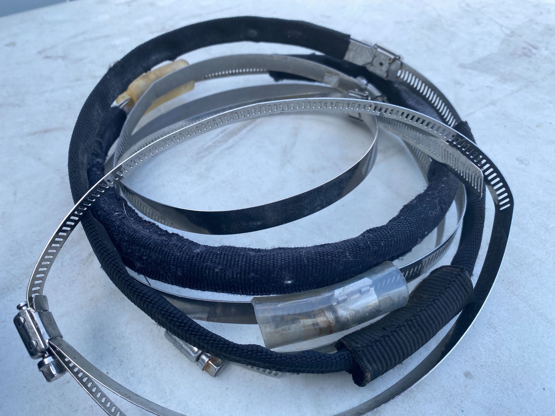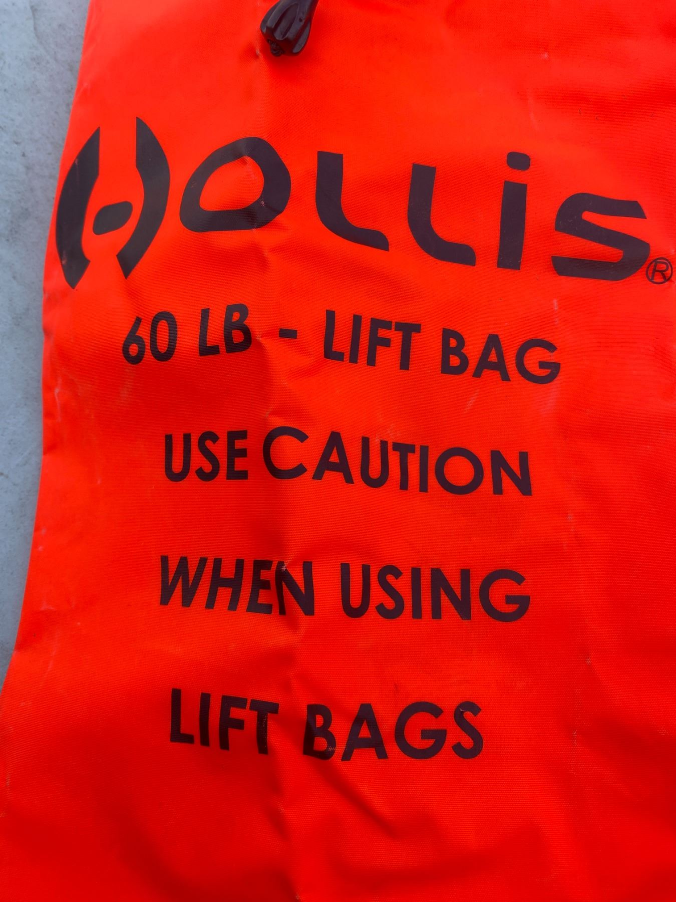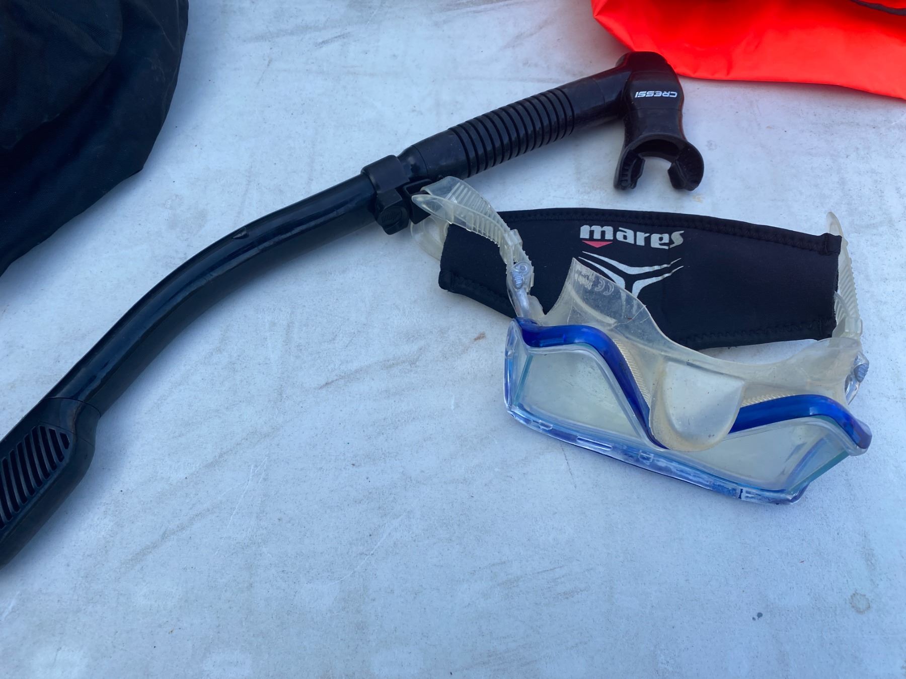 Mesh bag of assorted dive gear, Masks, Snorke, goggles, Two finger reels, 60lbs lift bag, orange, 1 delayed surface marker buoy yellow, Weight belts with metal clasps. Pickup at 11 am