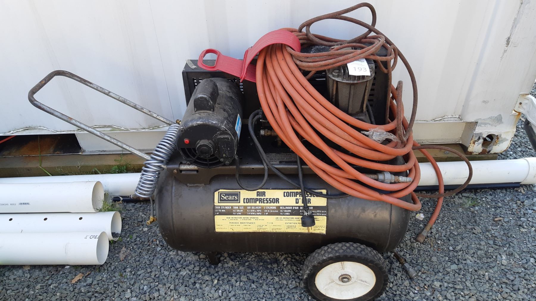 Air compressor & hose model 106.717260. One tire needs to be fitted properly. Untested. Pickup at 11 am