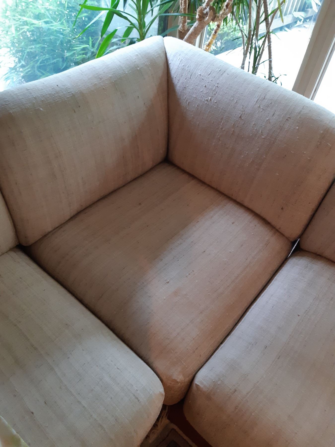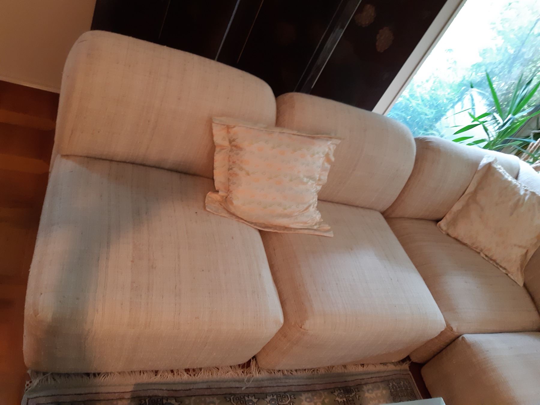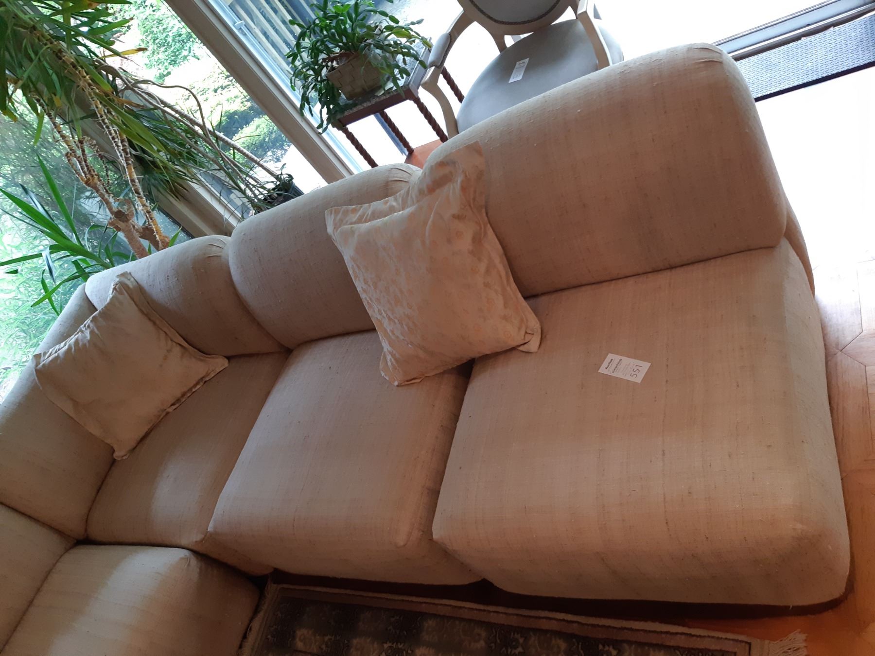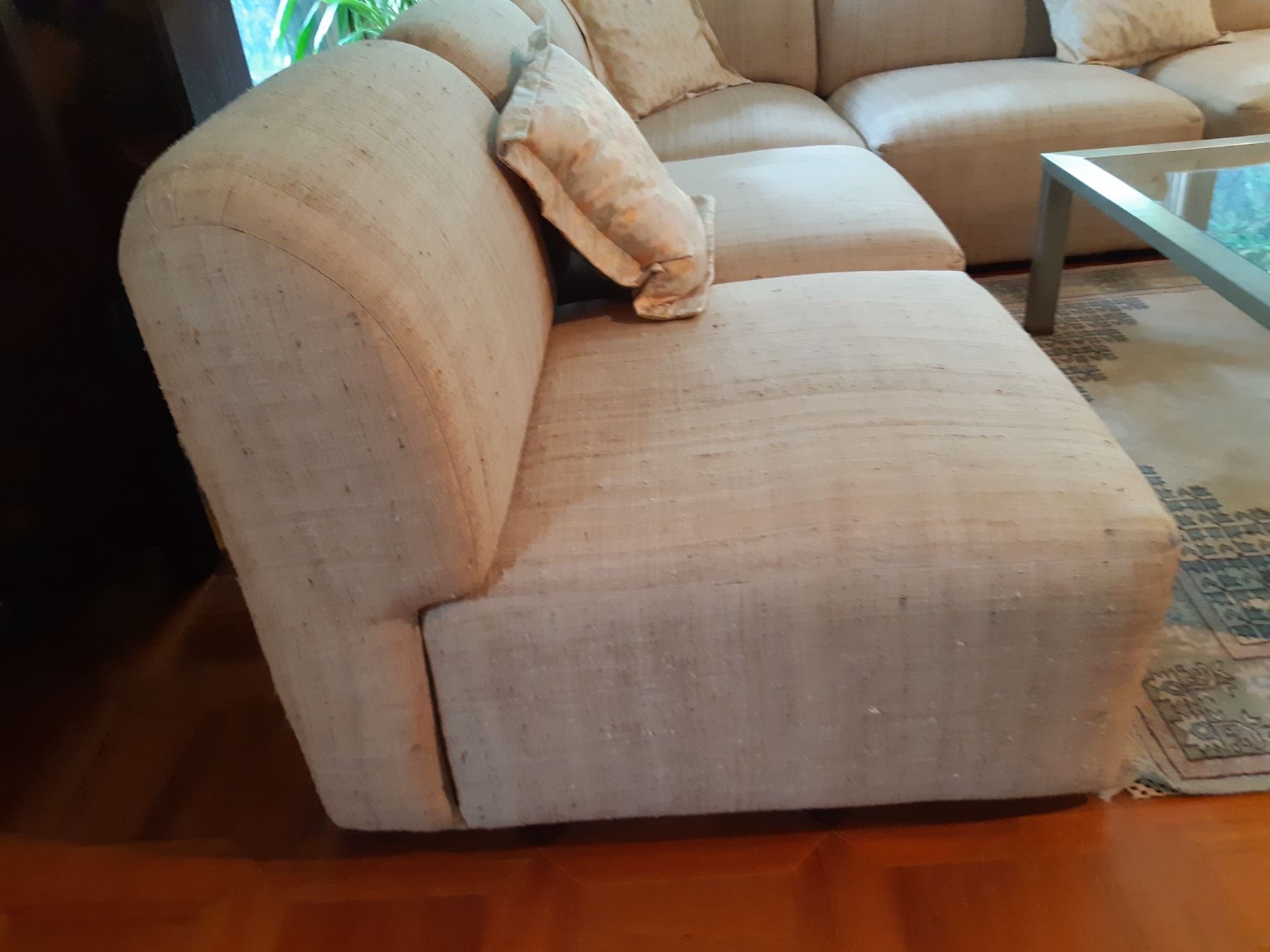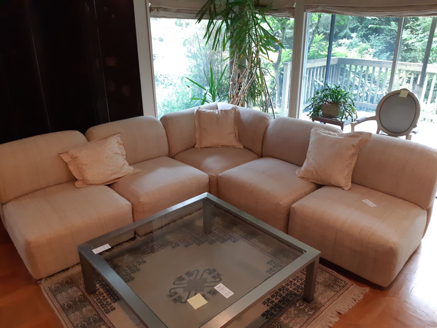 5 sectional sofa 4 x individual seats and one corner seat. Sofa has attached pillows. Fabric is a mixture of silk and other. 32x35x31 Pickup at 1:00 pm