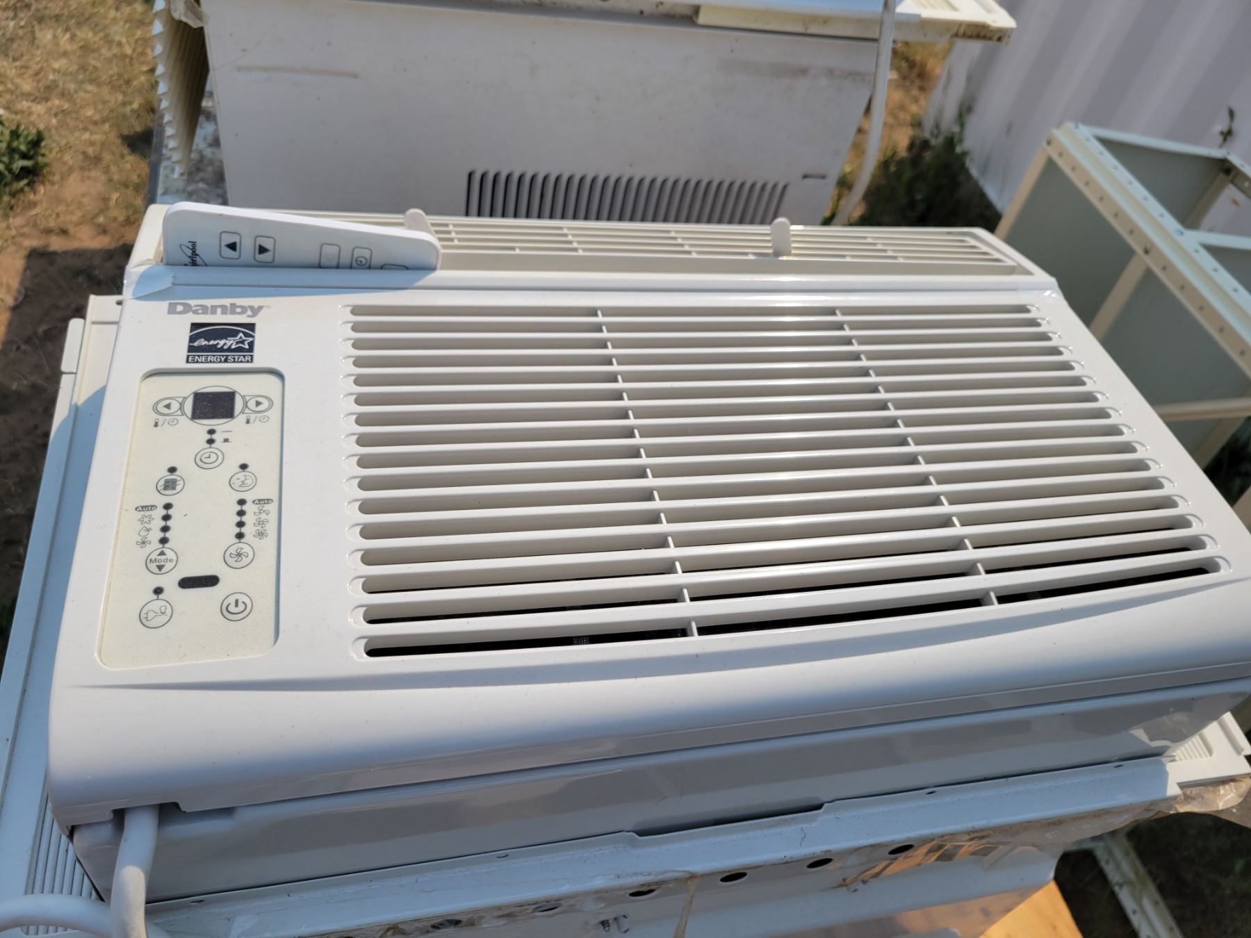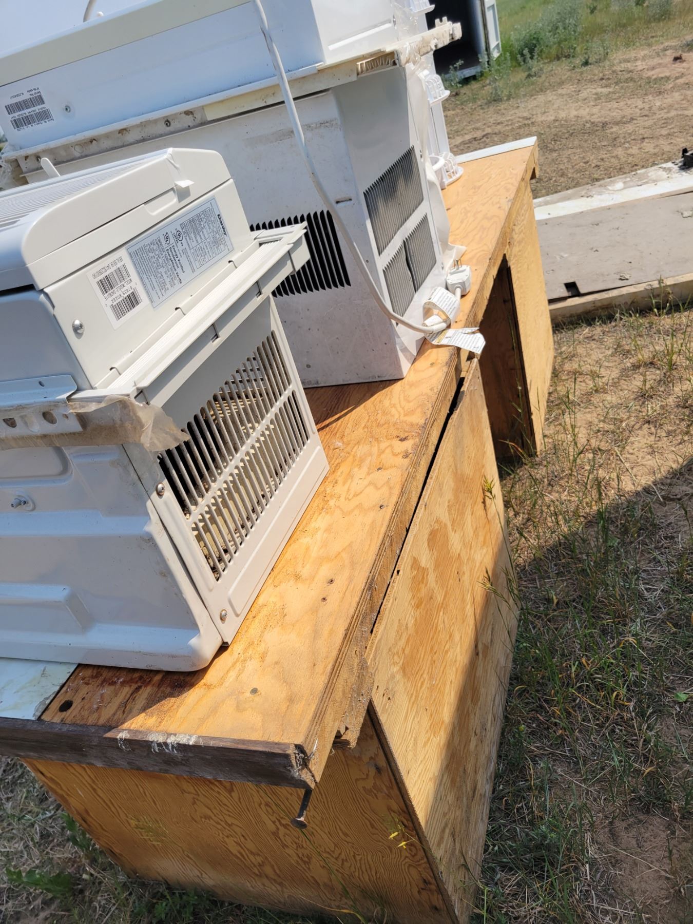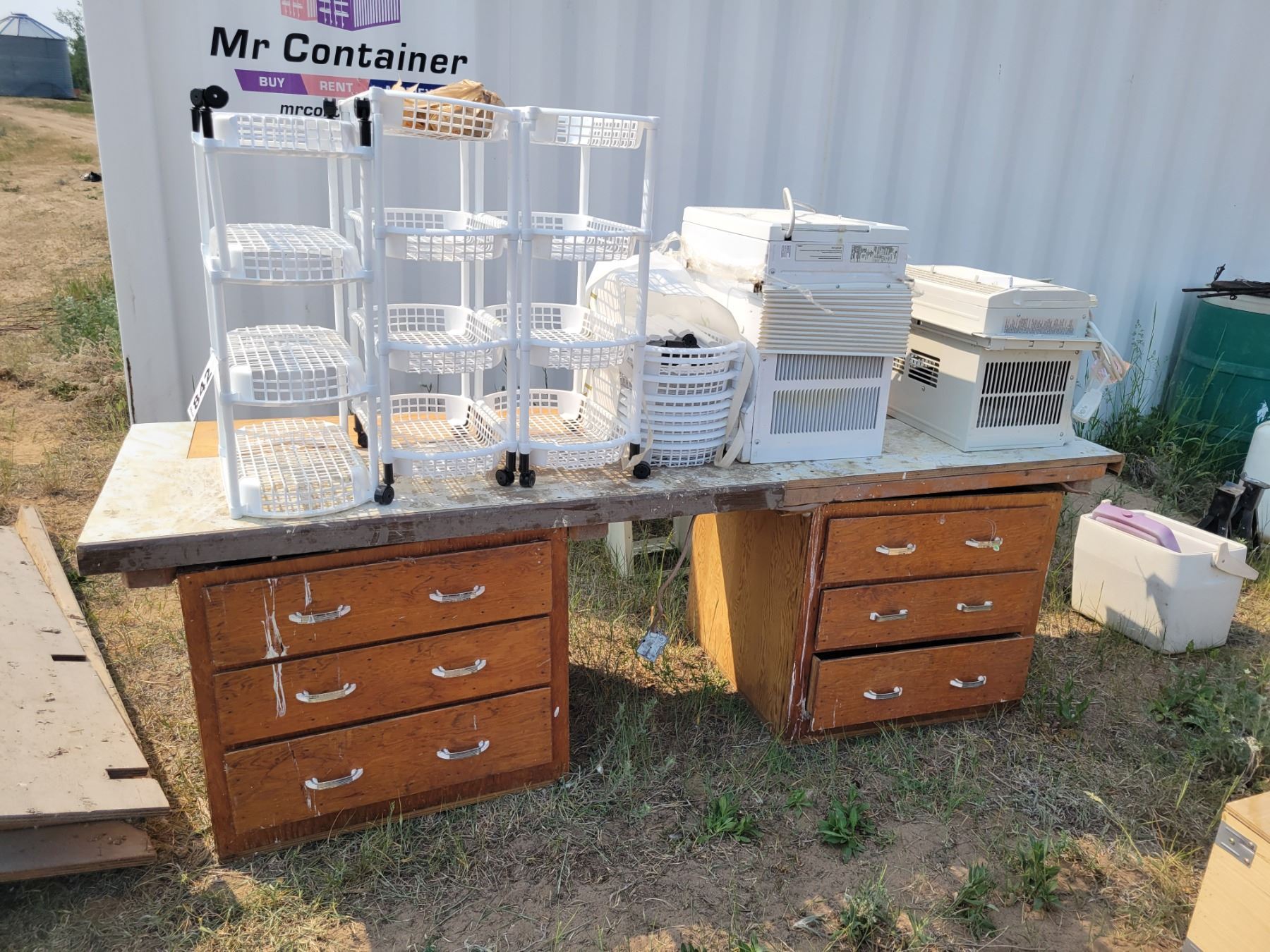 Selection of plastic racks, 2 air conditioning units, and wooden desk.