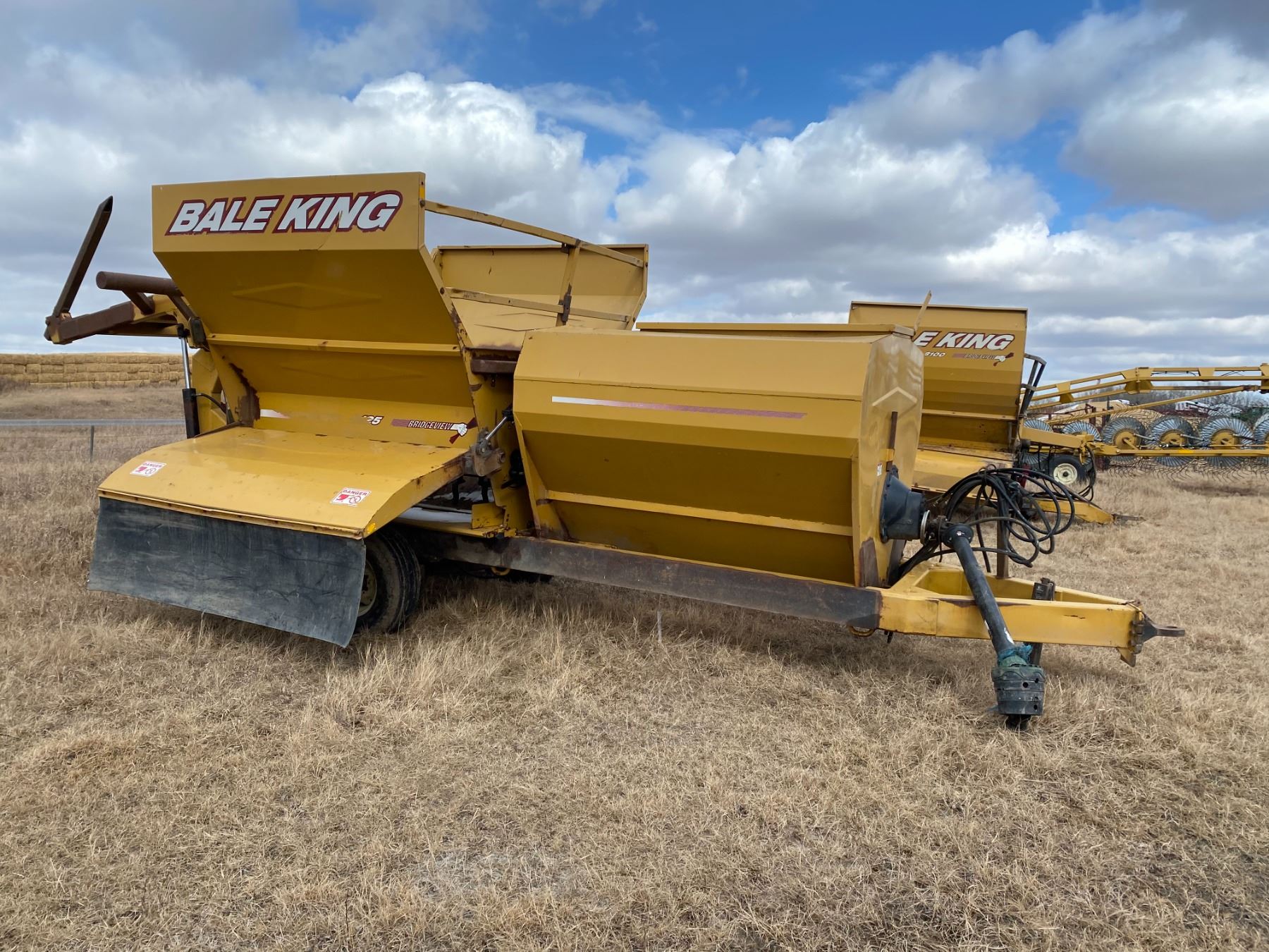 (Selling offsite, Ashmont, PH (780) 646-0727 ) Bale King 3125 tandem axle bale buster c/w grain tank, #BK5550, Good rubber, 1,000 PTO reinforced frame (needs some welding)