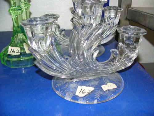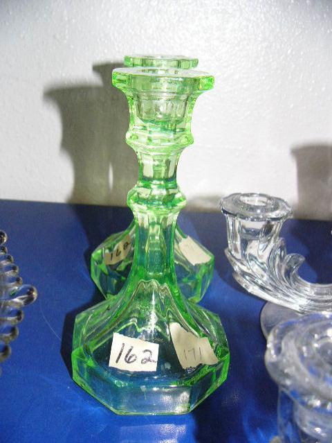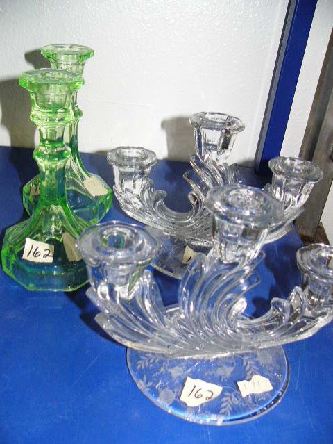 Set of 2 - 3 tiered candle holders with etched rose pattern on bottom 3 tier candle holders are also cornflower pattern and 2 green glass taper candle holders (171)
