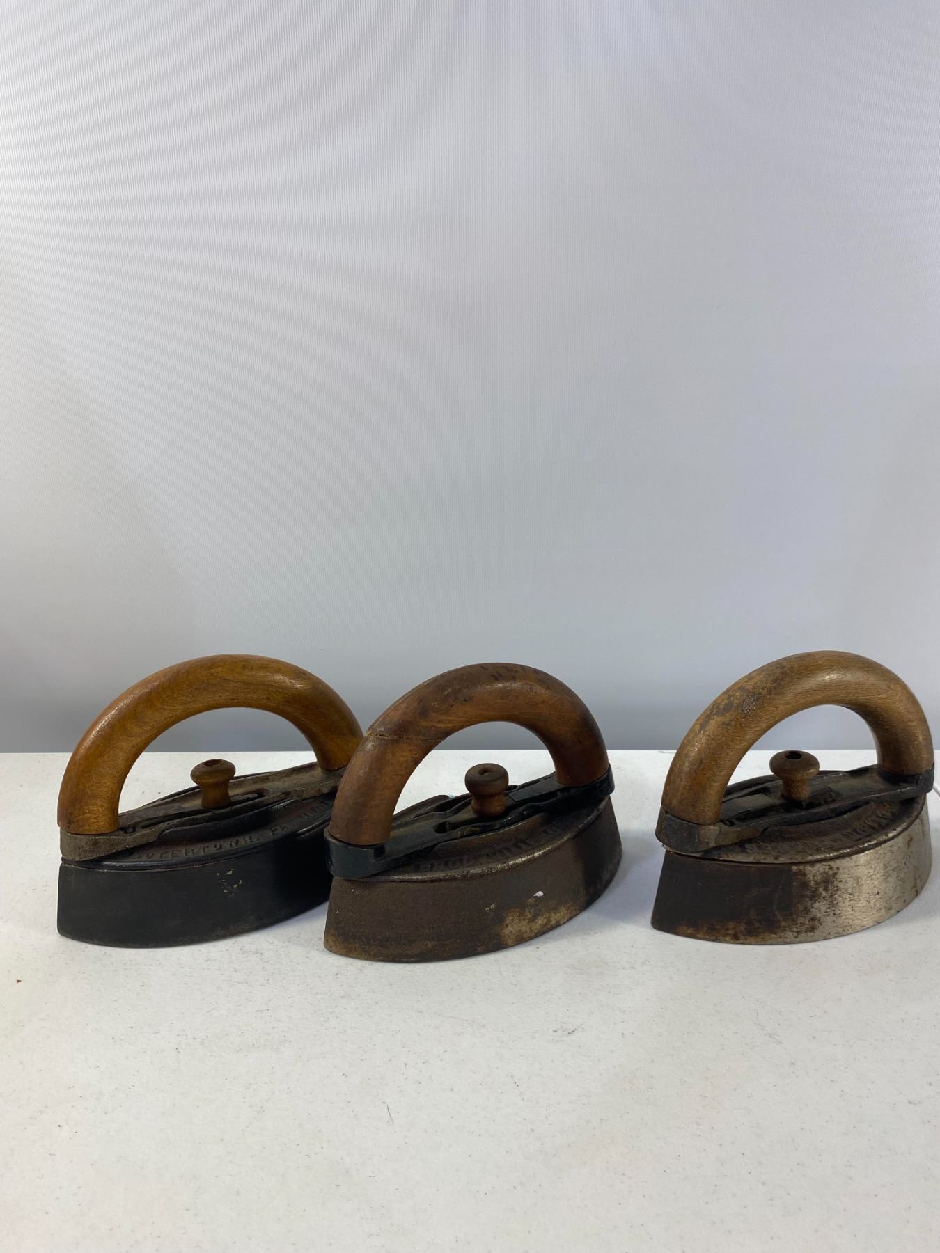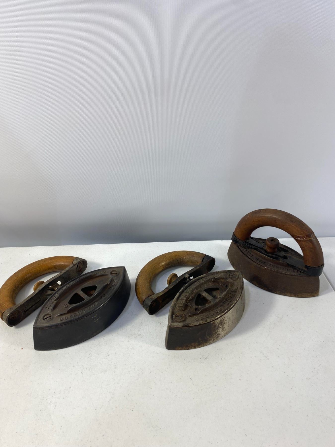 Group of three matching antique sad irons, each with a smooth cast base and turned wooden handle, marked with various U.S. foundry names including Watertown, PA and Brookville, OH. Dating to the late 1800searly 1900s, these heavy domestic tools were heated on stoves before the advent of electric irons. All display authentic aged patina, darkened surfaces, and typical oxidation, with handles showing minor finish wear. Solid and display-ready, with surface rust and age wear consistent with use.