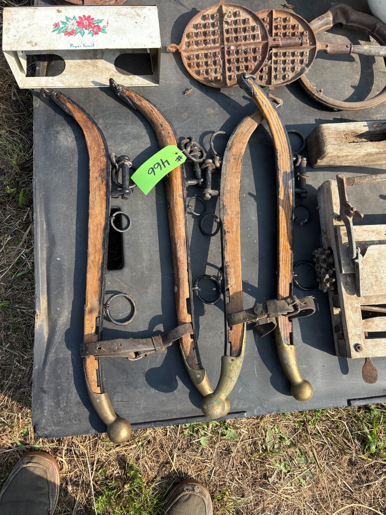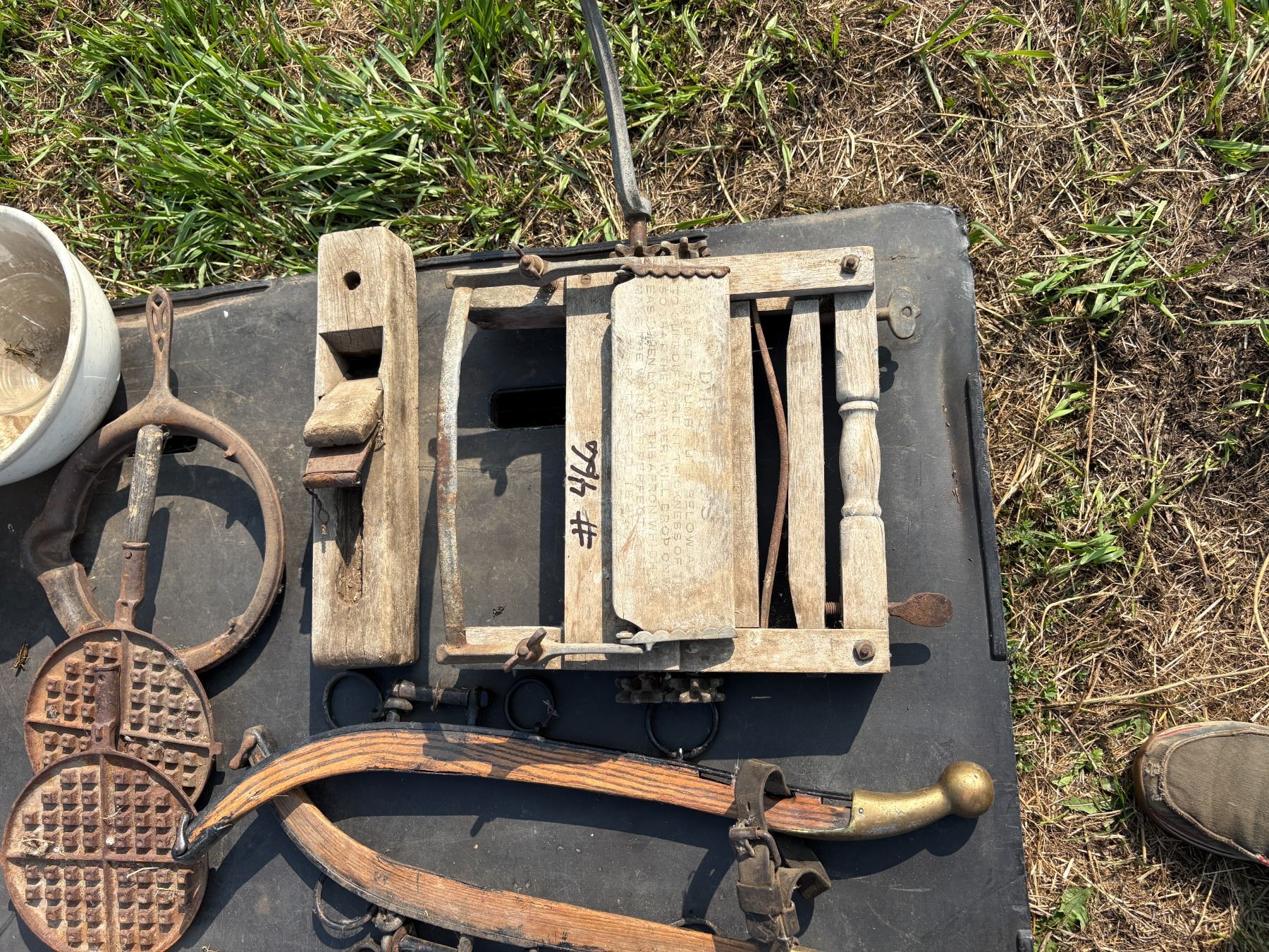 Set of hames, wringer, planer, pulley, bells, old towel dispenser, bowls and cow bell, yard light, potty and kids chair
