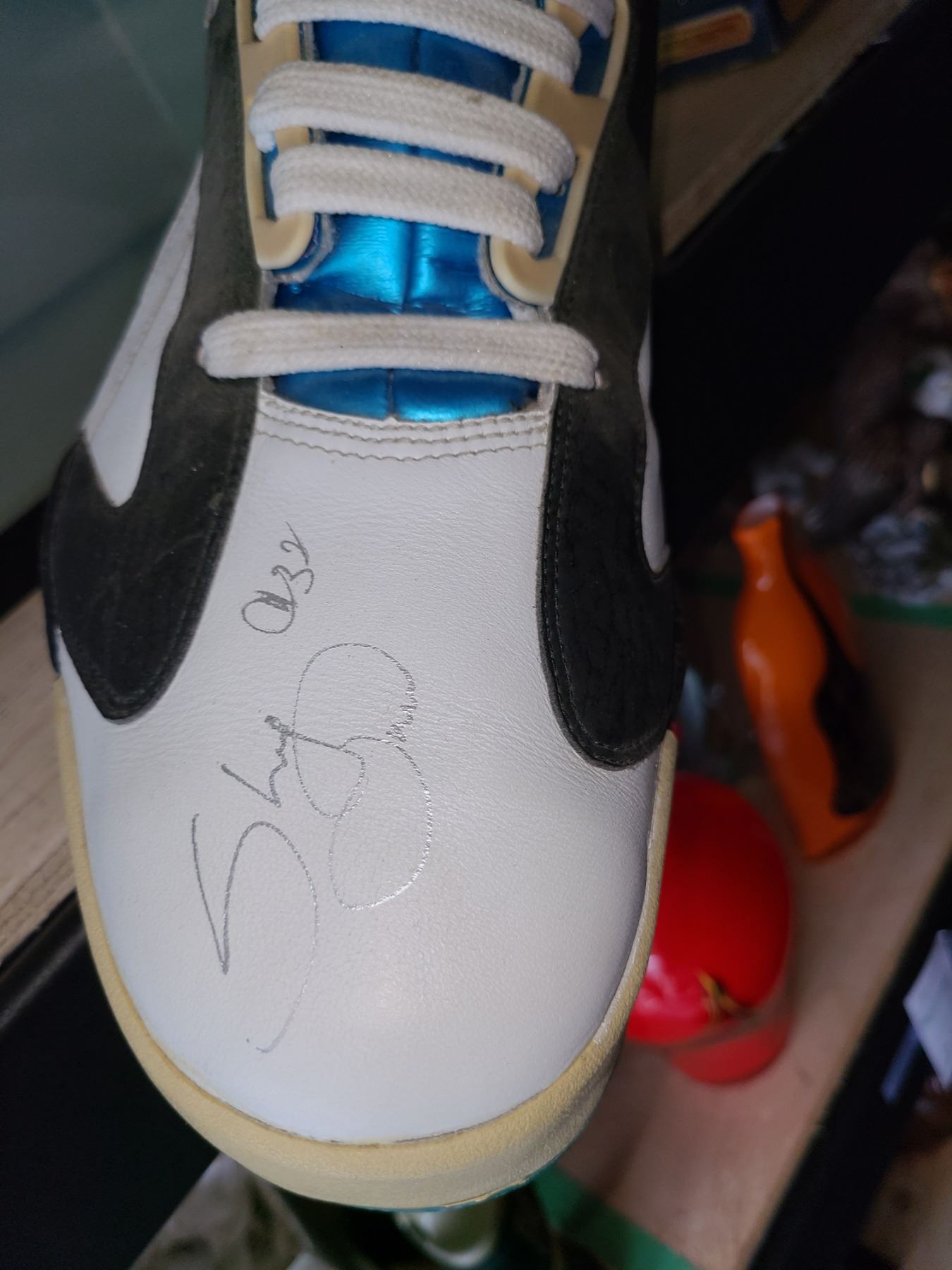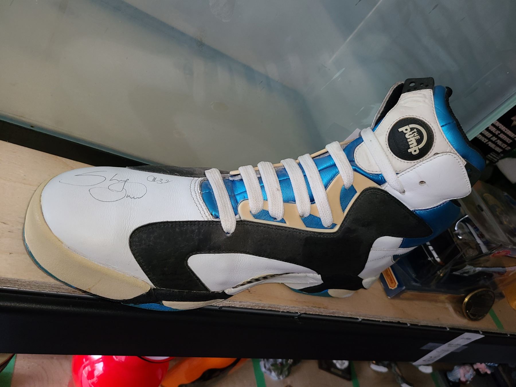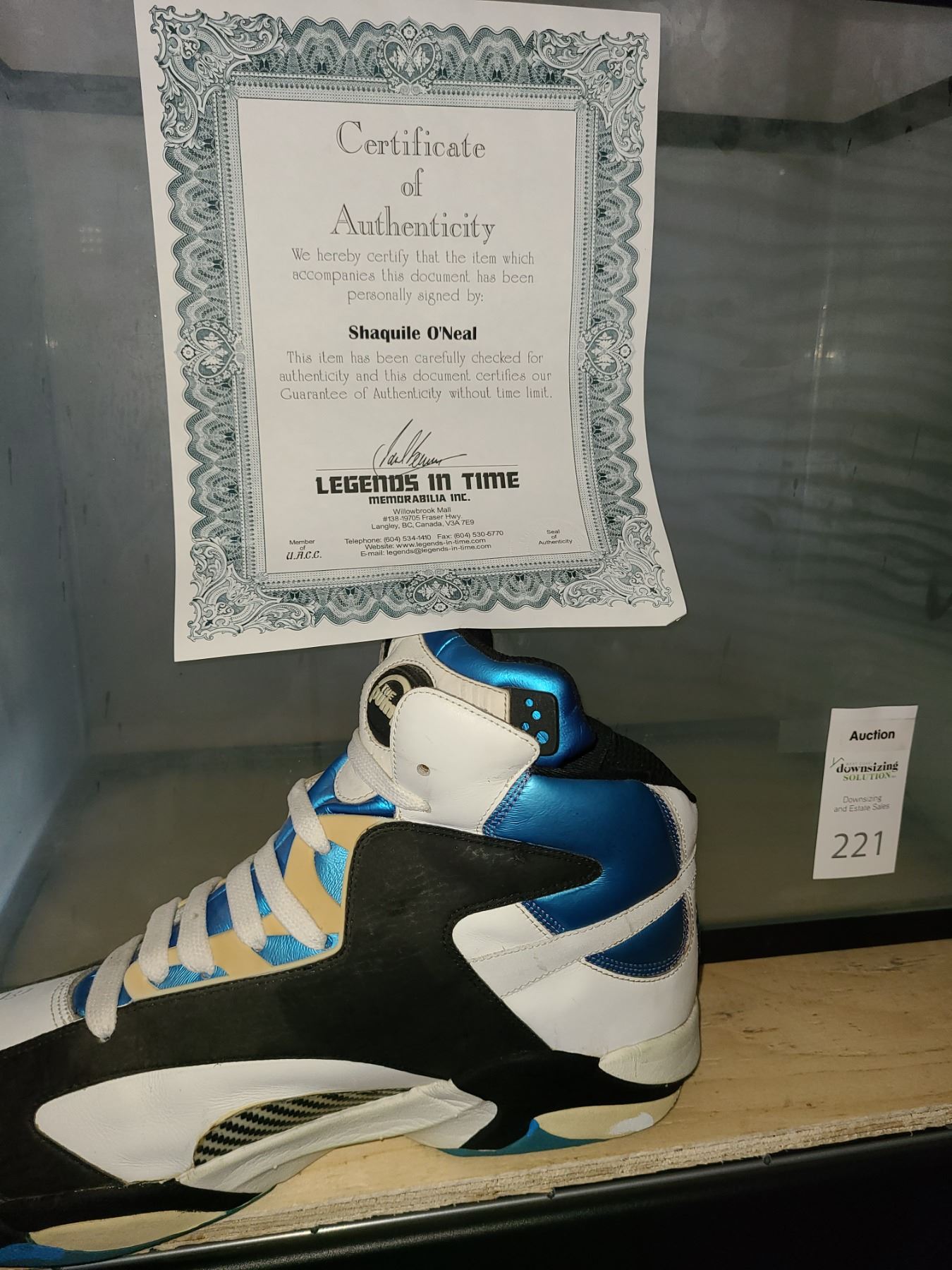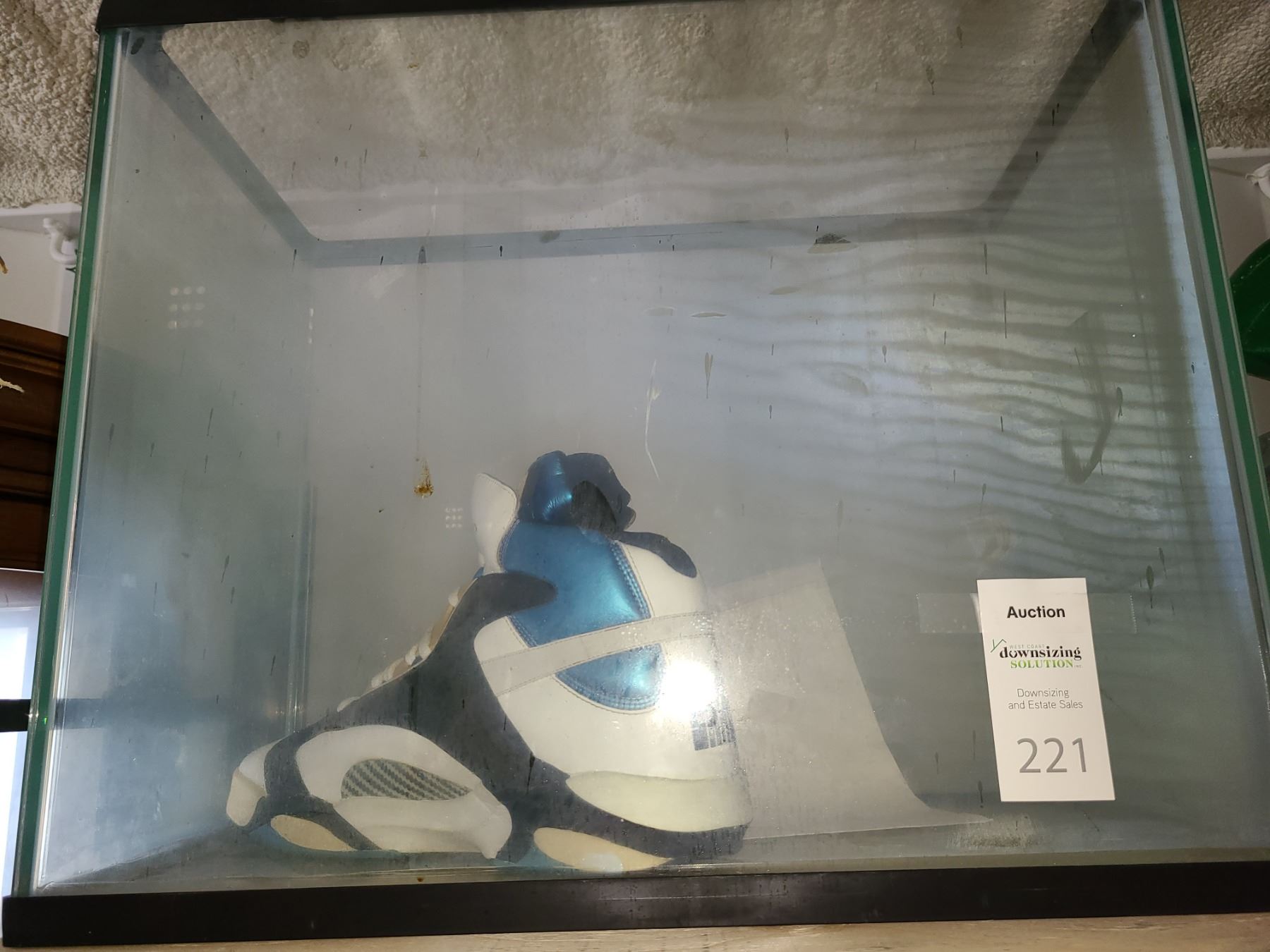 Signed basket ball shoe with Certificate of Authenticity with display case. Pickup at 9am