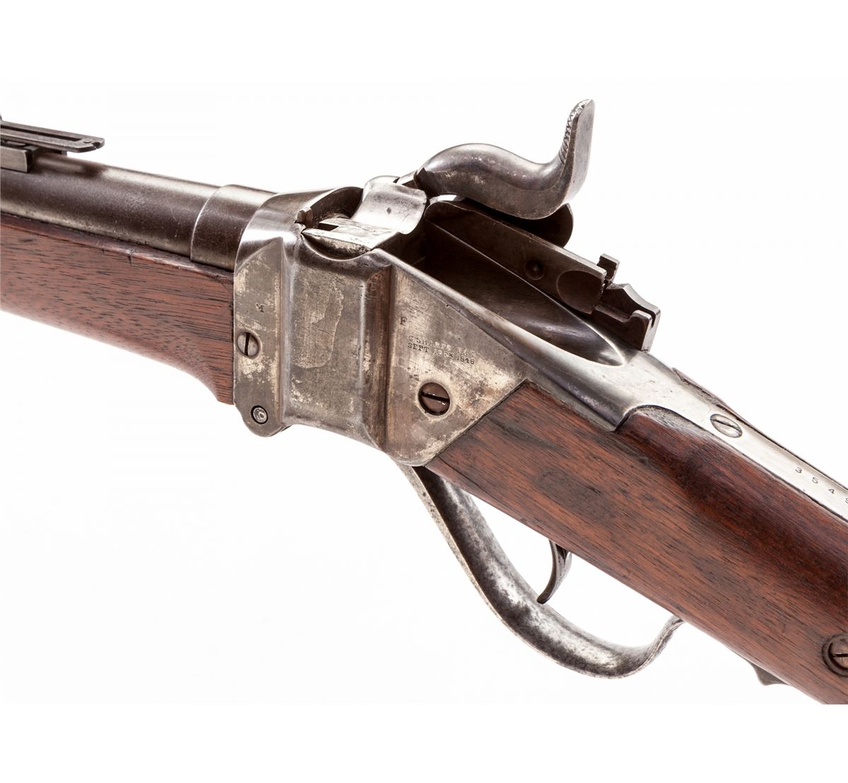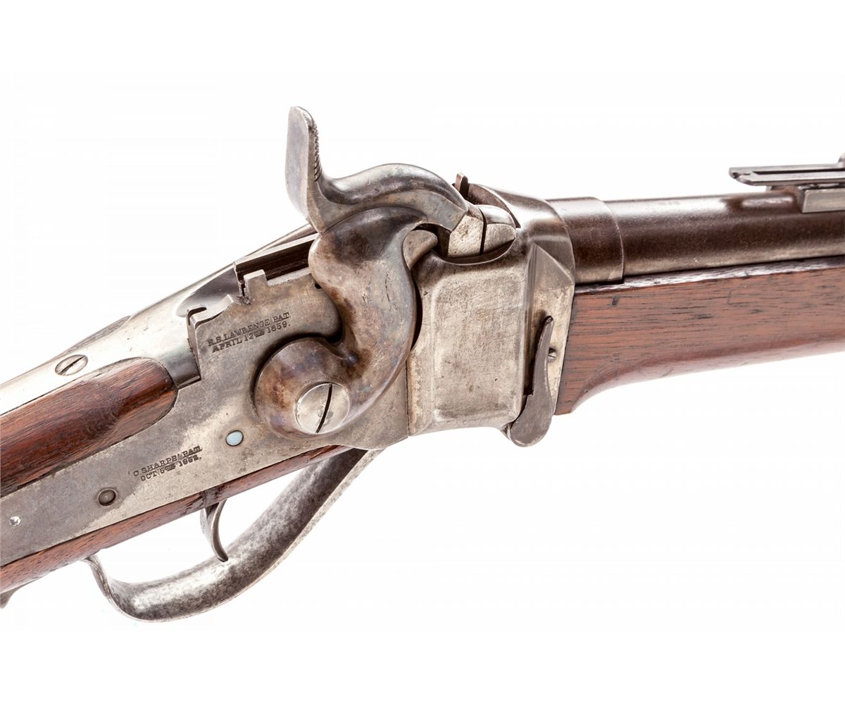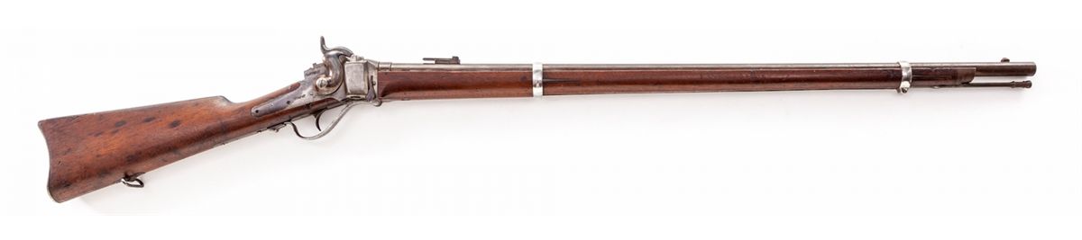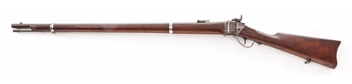 Sharps Two-Band Conversion Rifle, #35495, .50 RF cal., 34-7/8'' brown barrel, case hardened frame, walnut stock with Allin cartouche, with ramrod. Condition is about fine retaining approx. 85% lightly toning brown barrel. Nickel bands with minor corrosion. Frame has toned a silvery gray. Stock shows light sanding and relatively clear cartouche. Action is crisp, bore is fine to excellent. Est.: $1,200-$1,800. (Antique) JAN