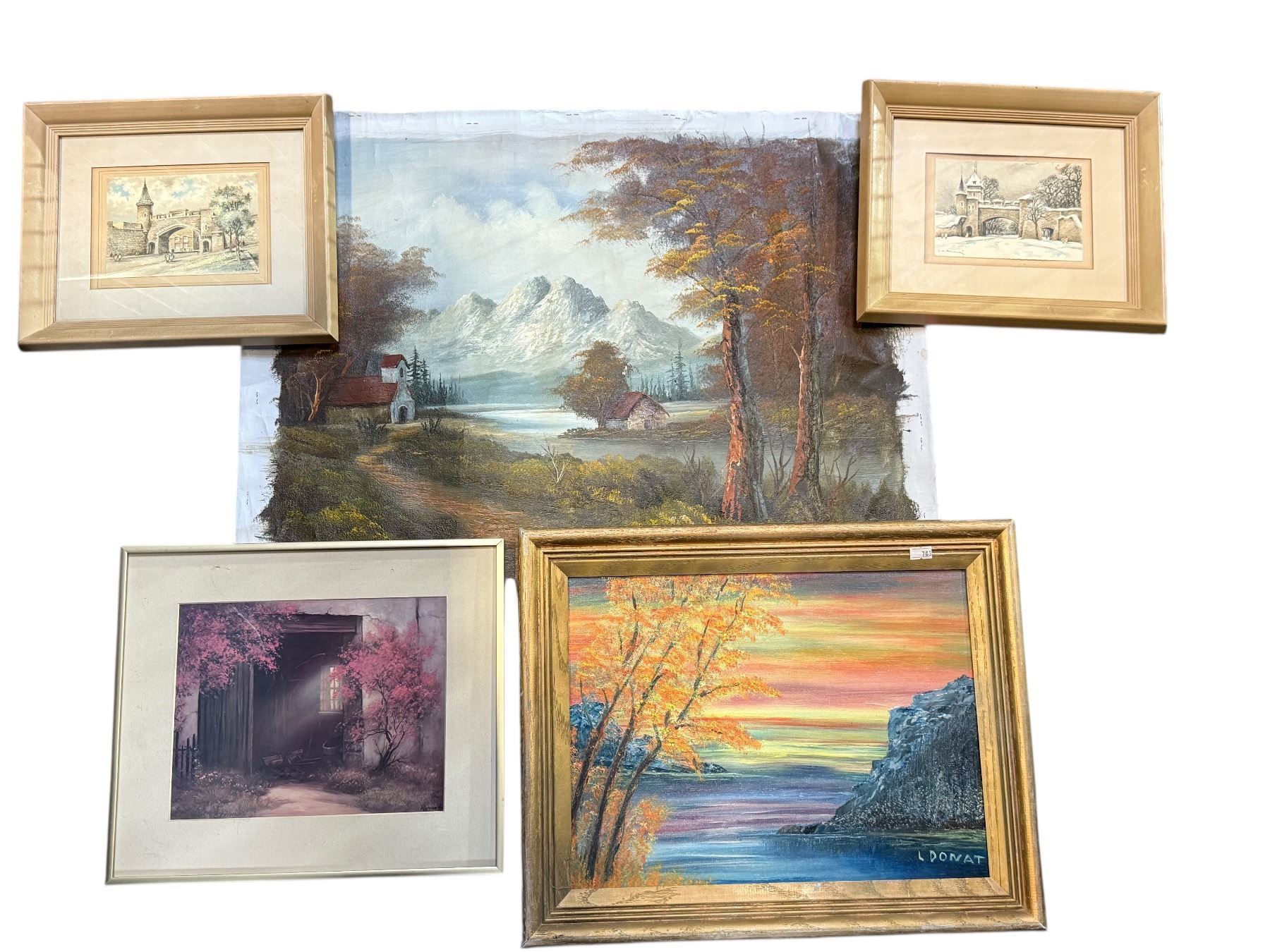 Shelf of assorted vintage framed signed portraits & paintings