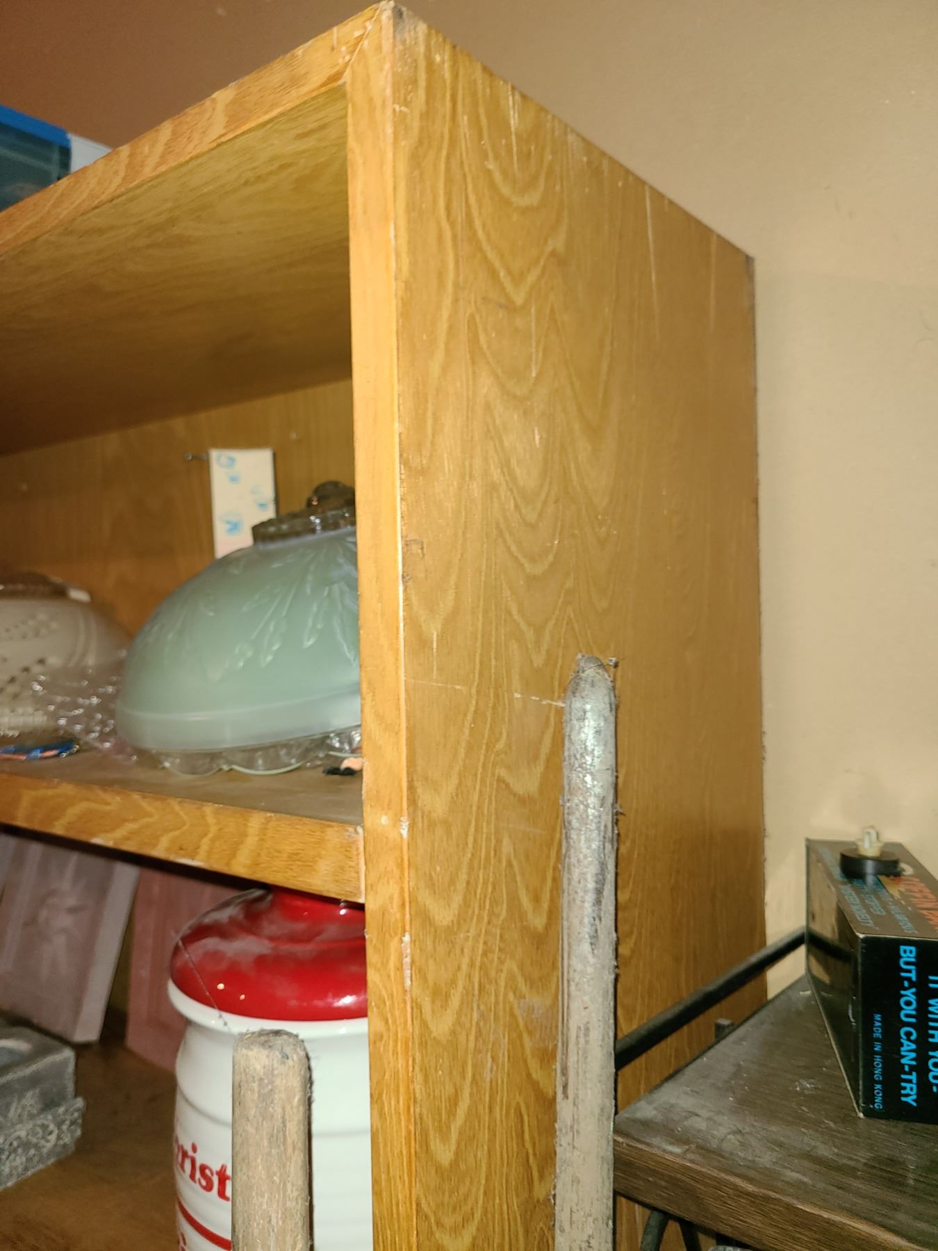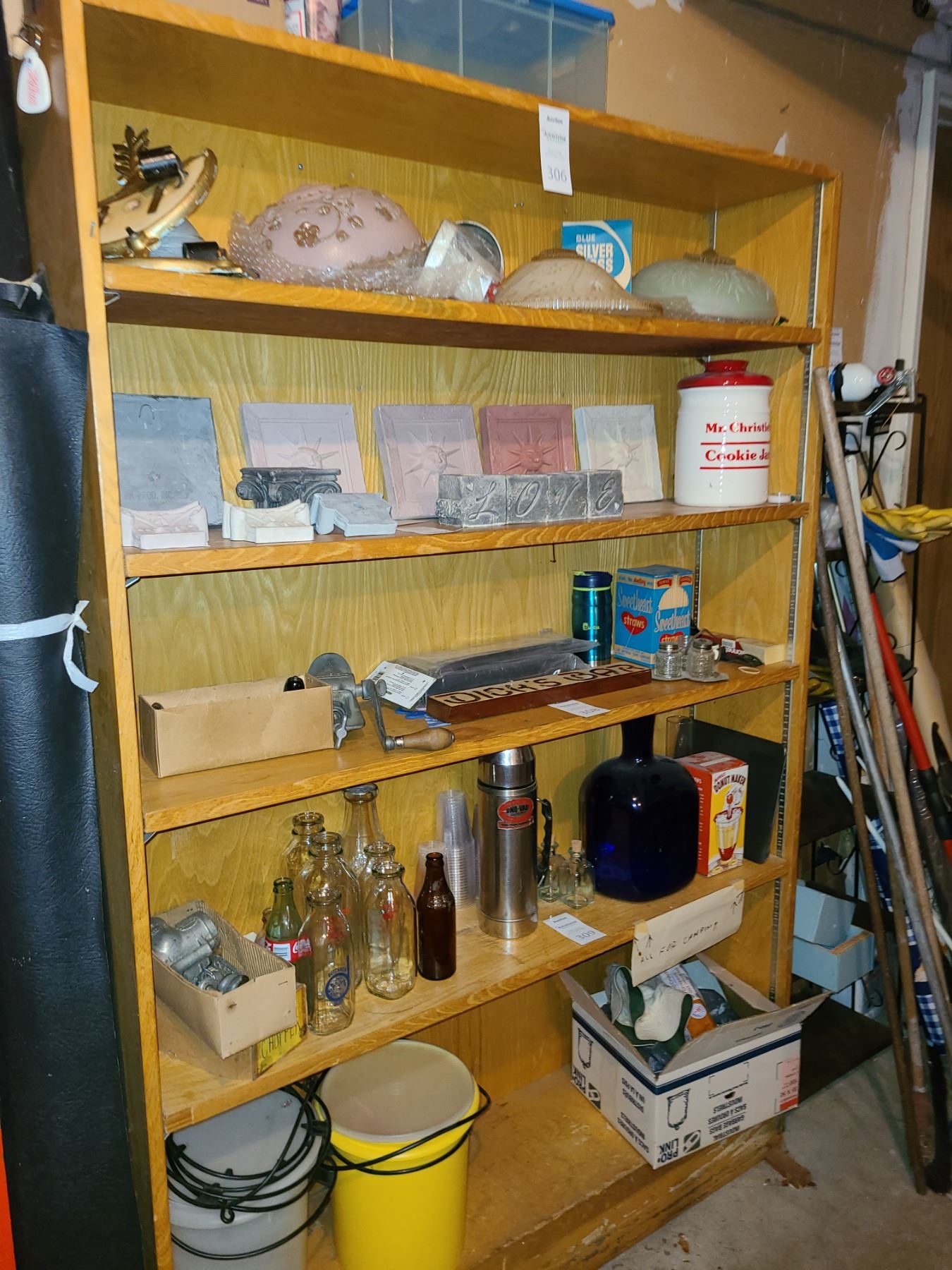 Wood shelving approximate 48x8x70 heavy bring help to remove from garage, Contents not included. Pickup at 11 am