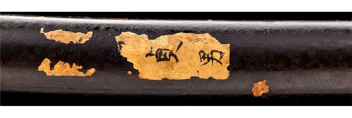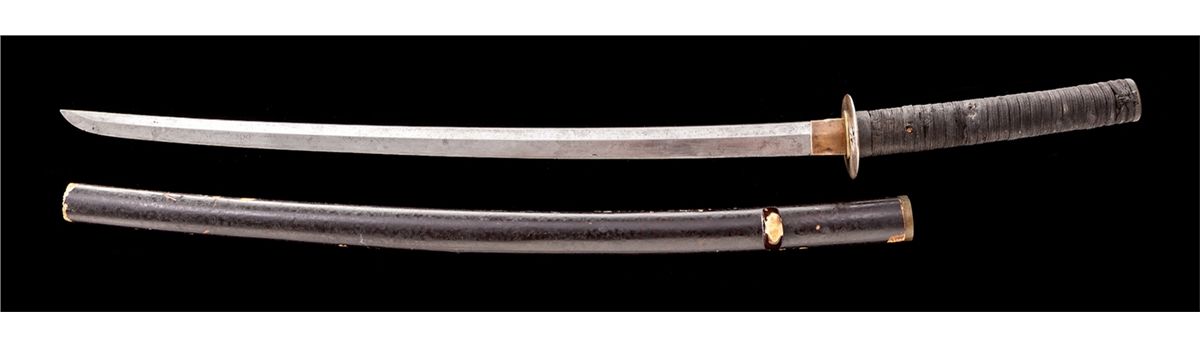 Shinto Period Samurai Sword, with battle wrap handle and pierced iron tsuba, unsigned tang, in lacquered wooden scabbard. Visible blade length is 25-1/8''; overall length is 36-1/2'' in mount. Condition is fair. Blade with carbon spotting and some inclusions along edge. Est.: $600-$800.