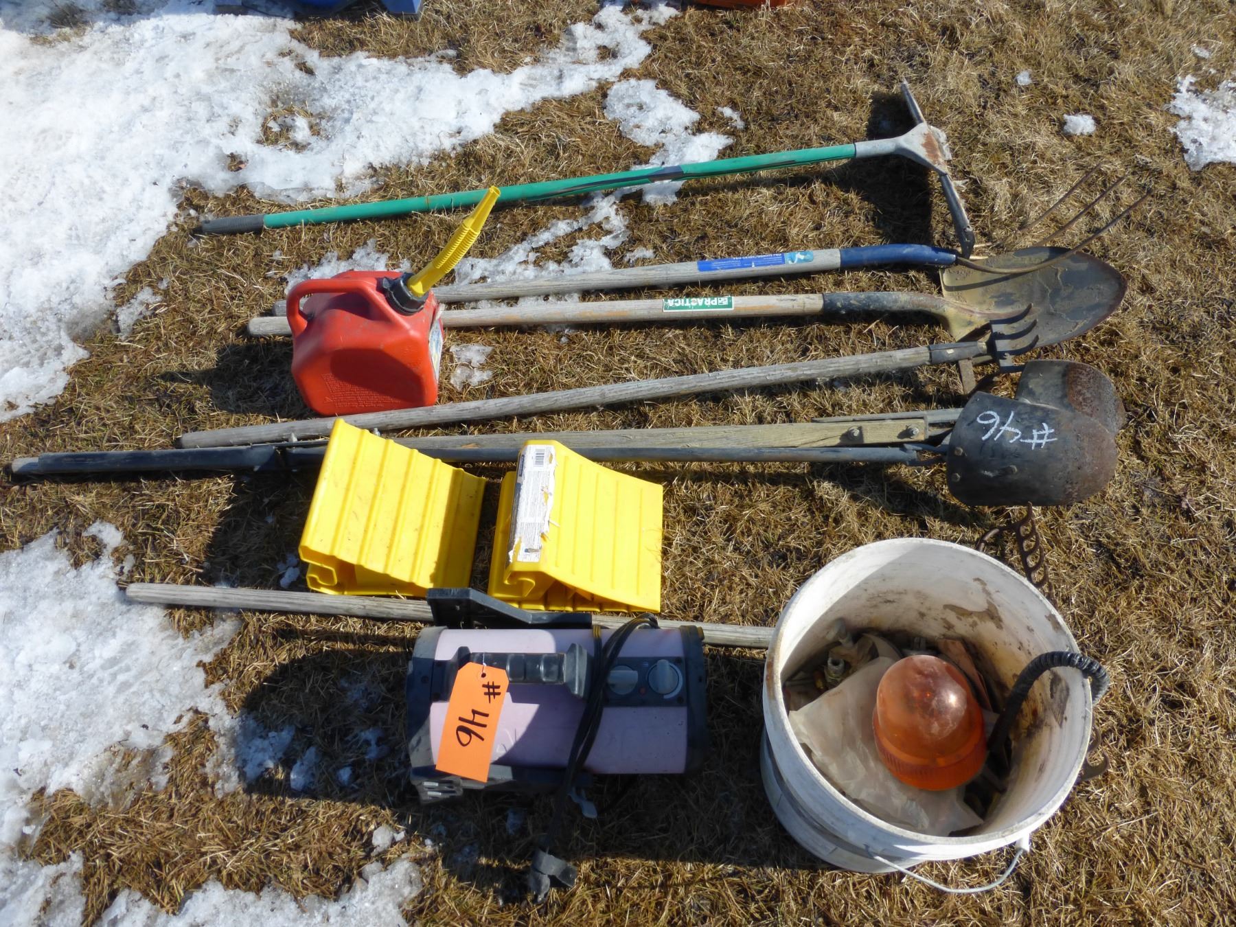 Shovel, rake, pitch fork, lights, post hole digger and heater