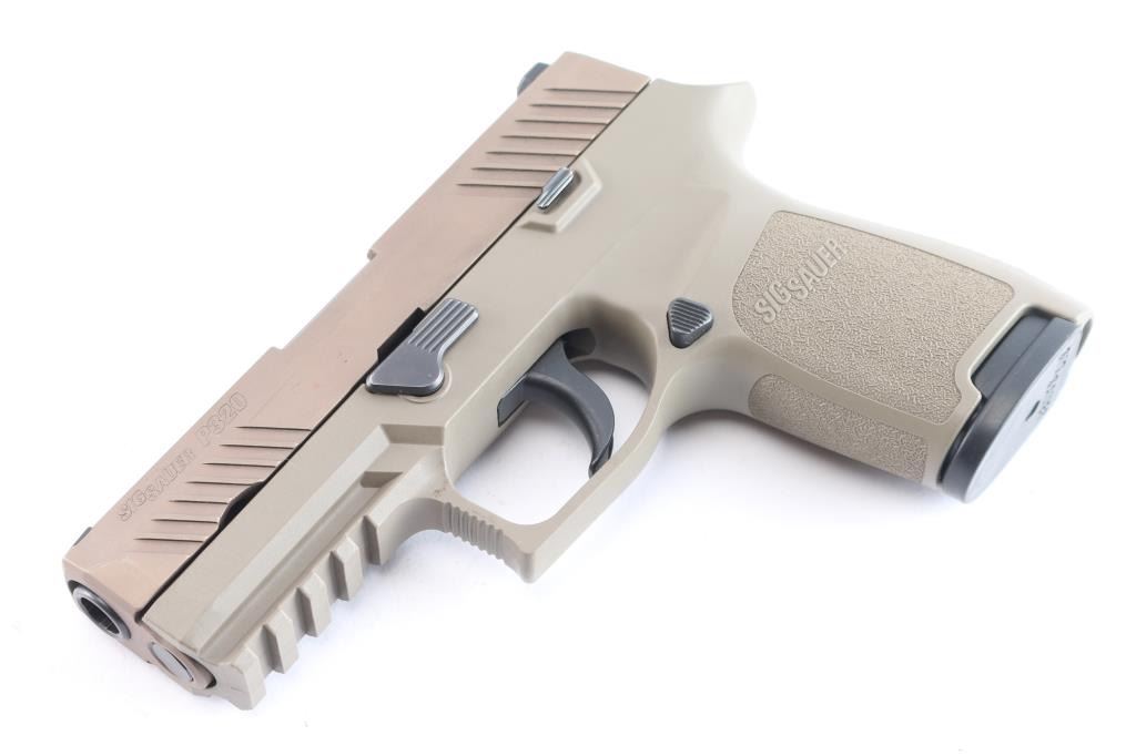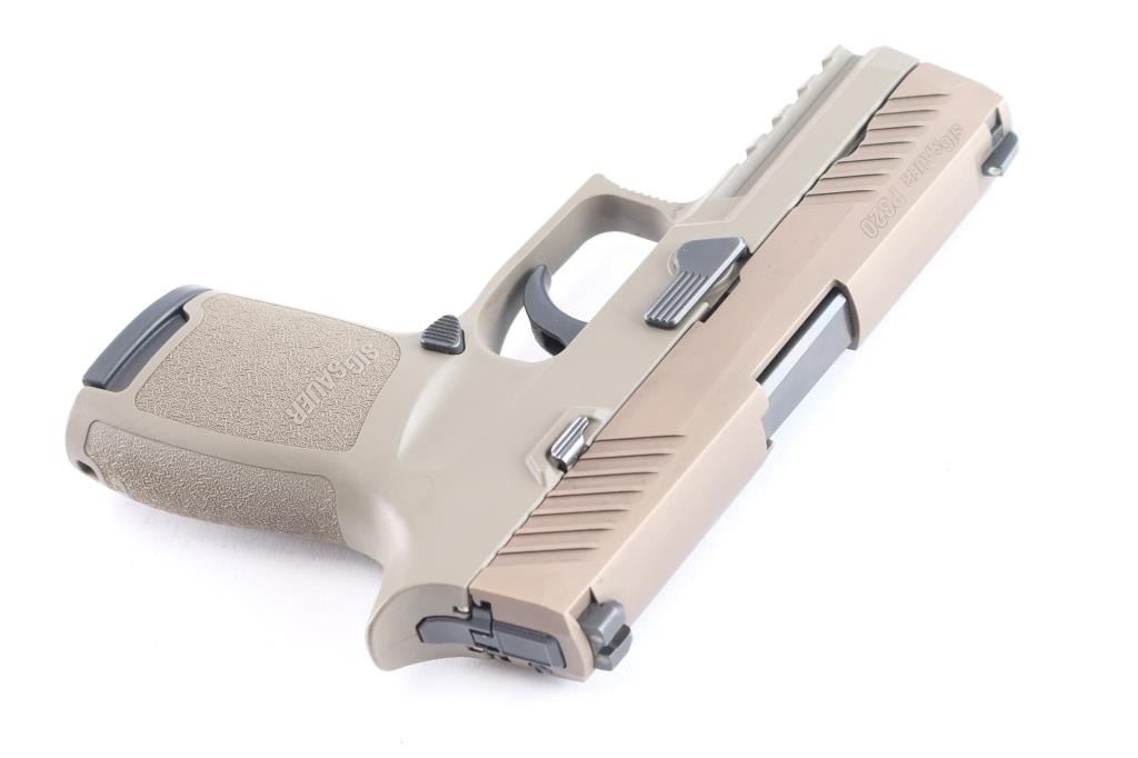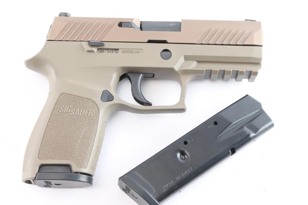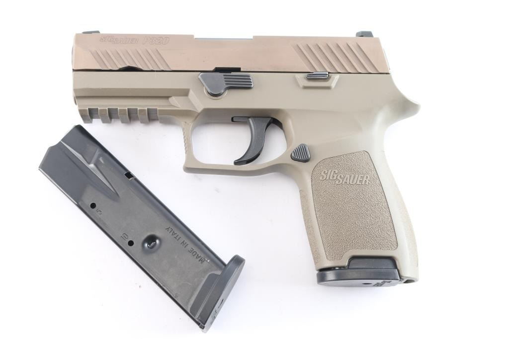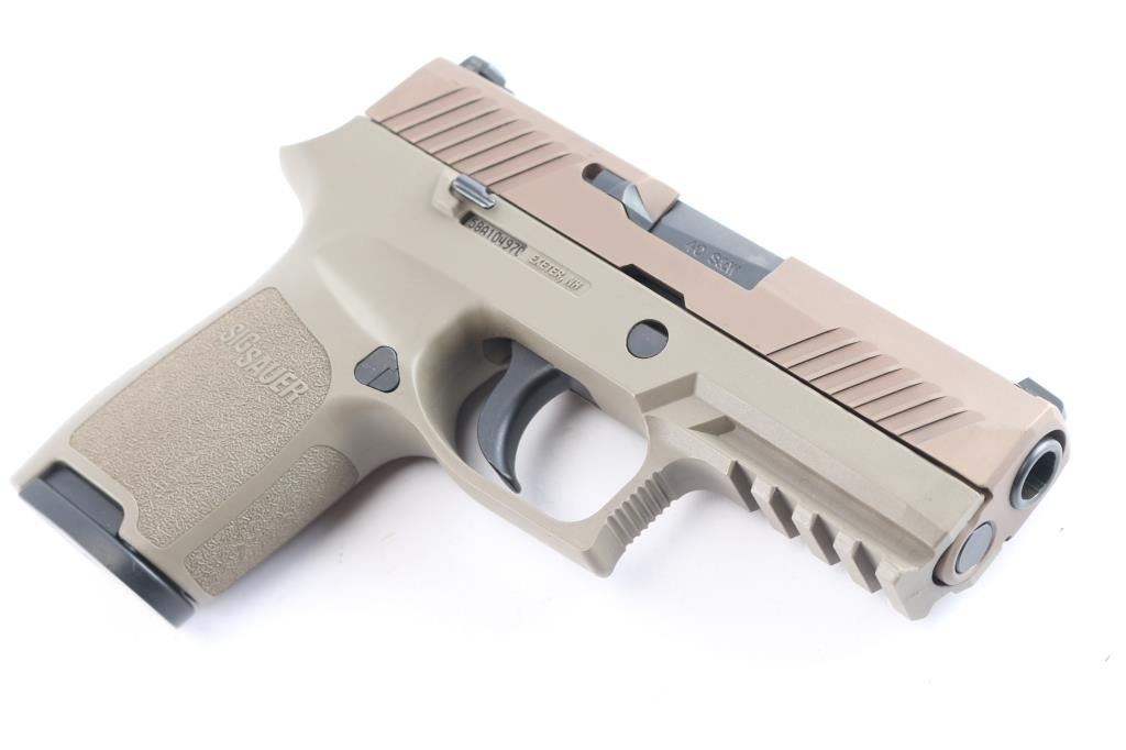 Semi-automatic pistol features approx 3.75" barrel, 3 dot night sights in dovetails, striker fired, dark earth or FDE finish, matte black controls, tan colored polymer frame with accessory rail, reversible push button mag release, ambi slide lock. Bore is excellent/bright. Retains 98% finish with little wear. Night sights easily visible in a dark room. Comes with two magazines, 13rd & 10rd. Condition is NRA excellent. ***Modern Firearm***.