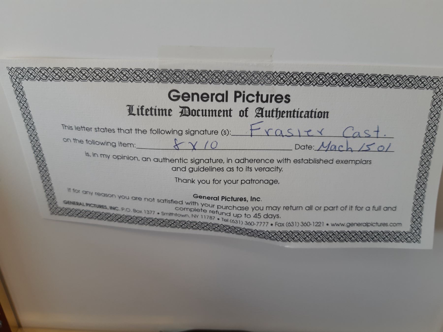 Signed 8x10 with cast signitures, Certificate of Authenticity It is the'responsibility' of purchaser to research verification. Pickup at 9 am