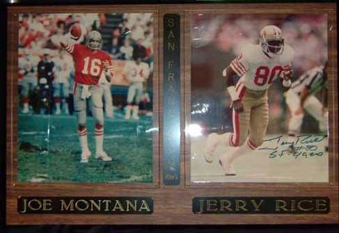 Joe Montana and Jerry Rice autographed photos mounted on plaque.