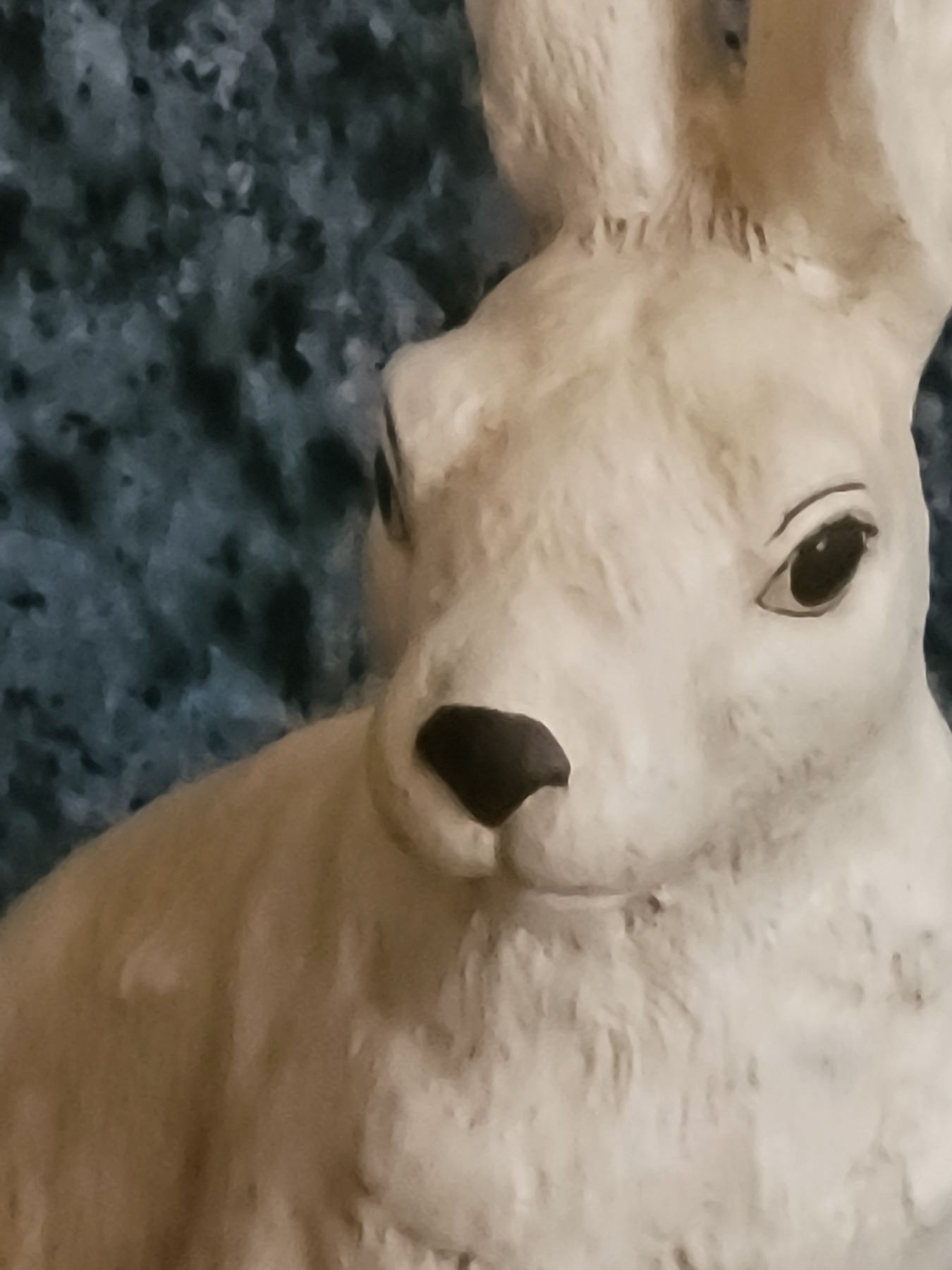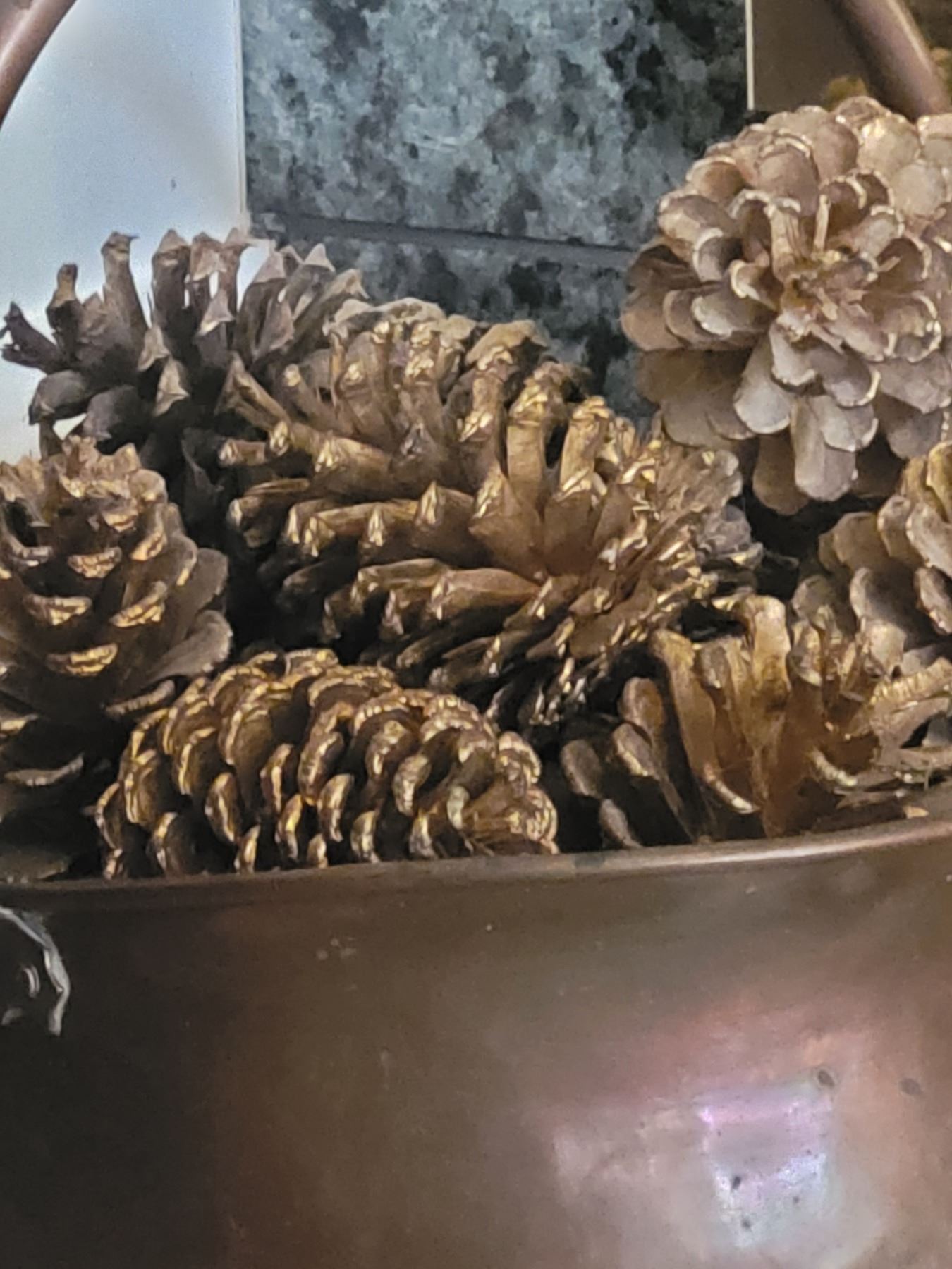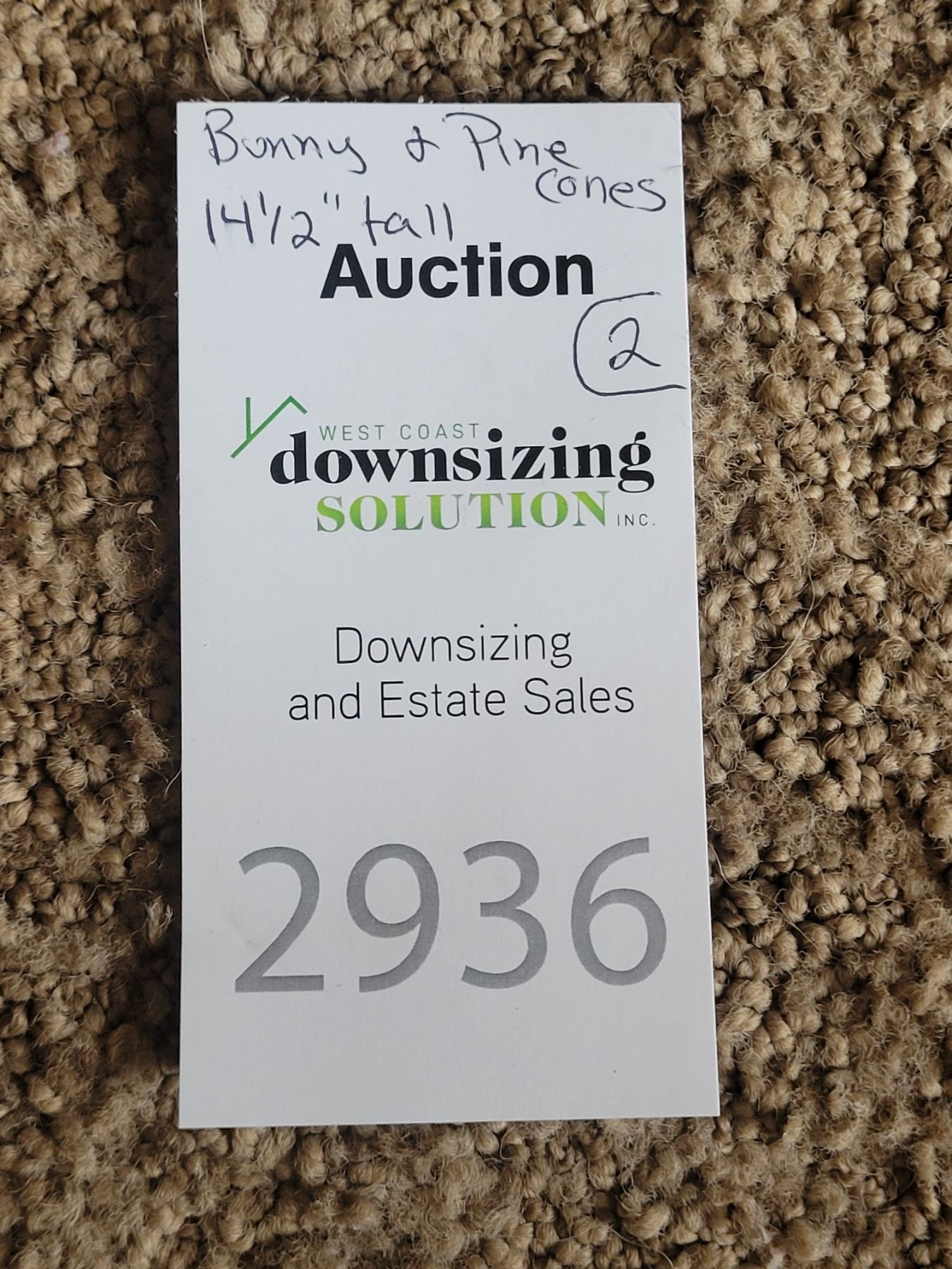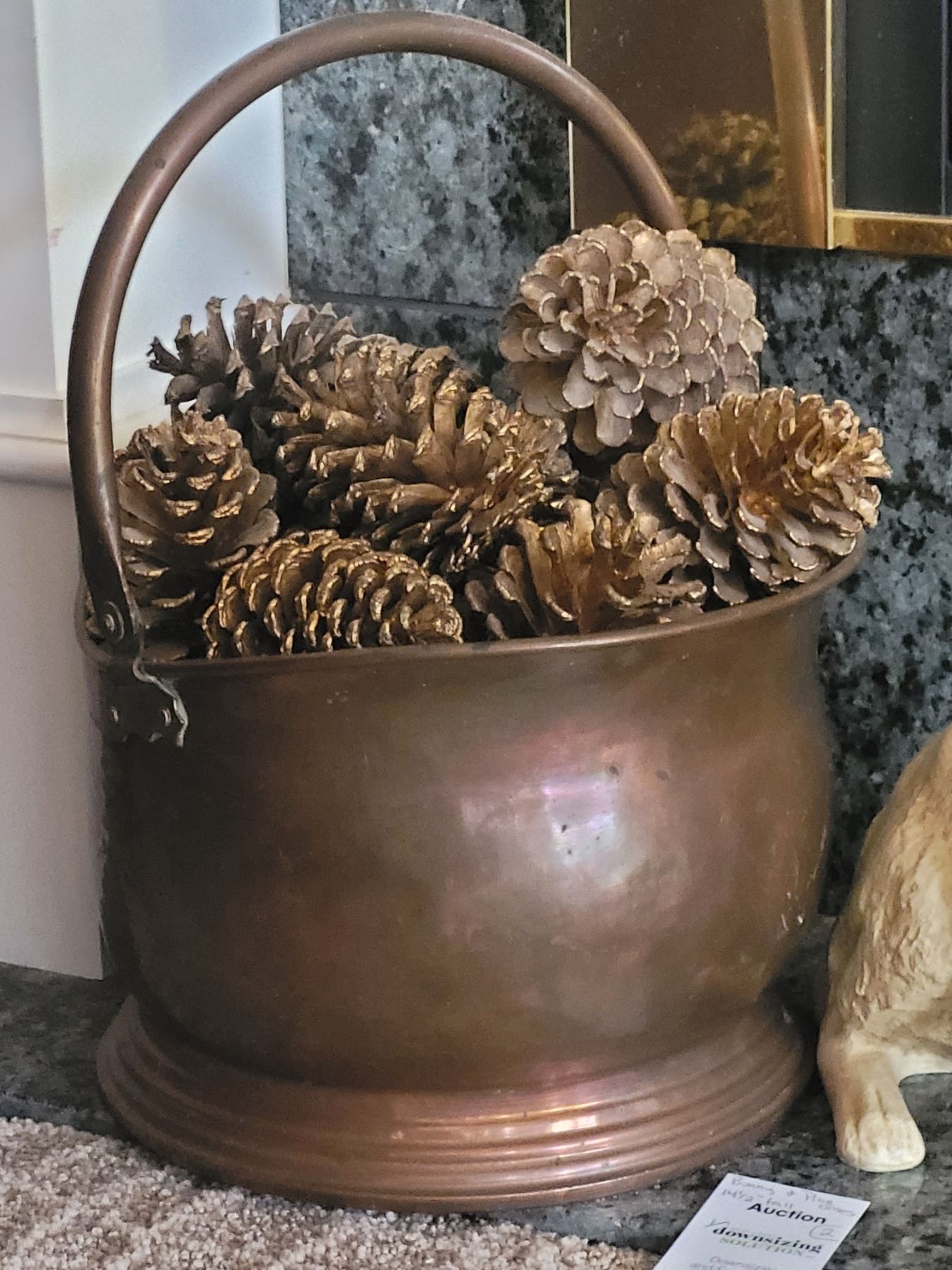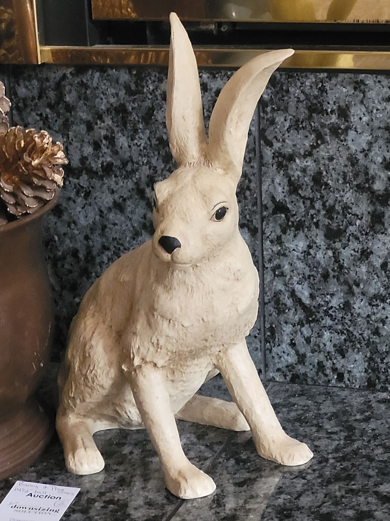 Signed resin rabbit 14 tall, copper bucket with pine cones. Pickup 9am