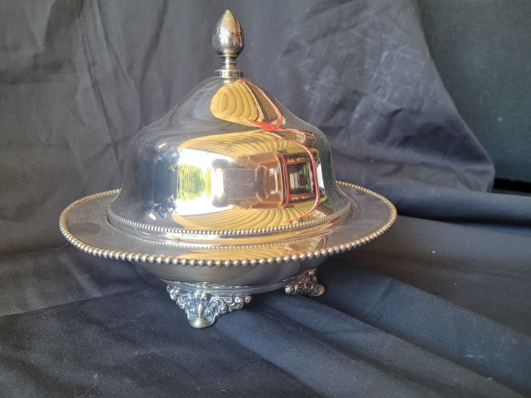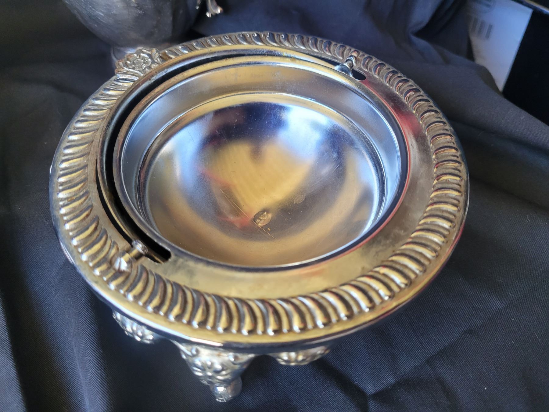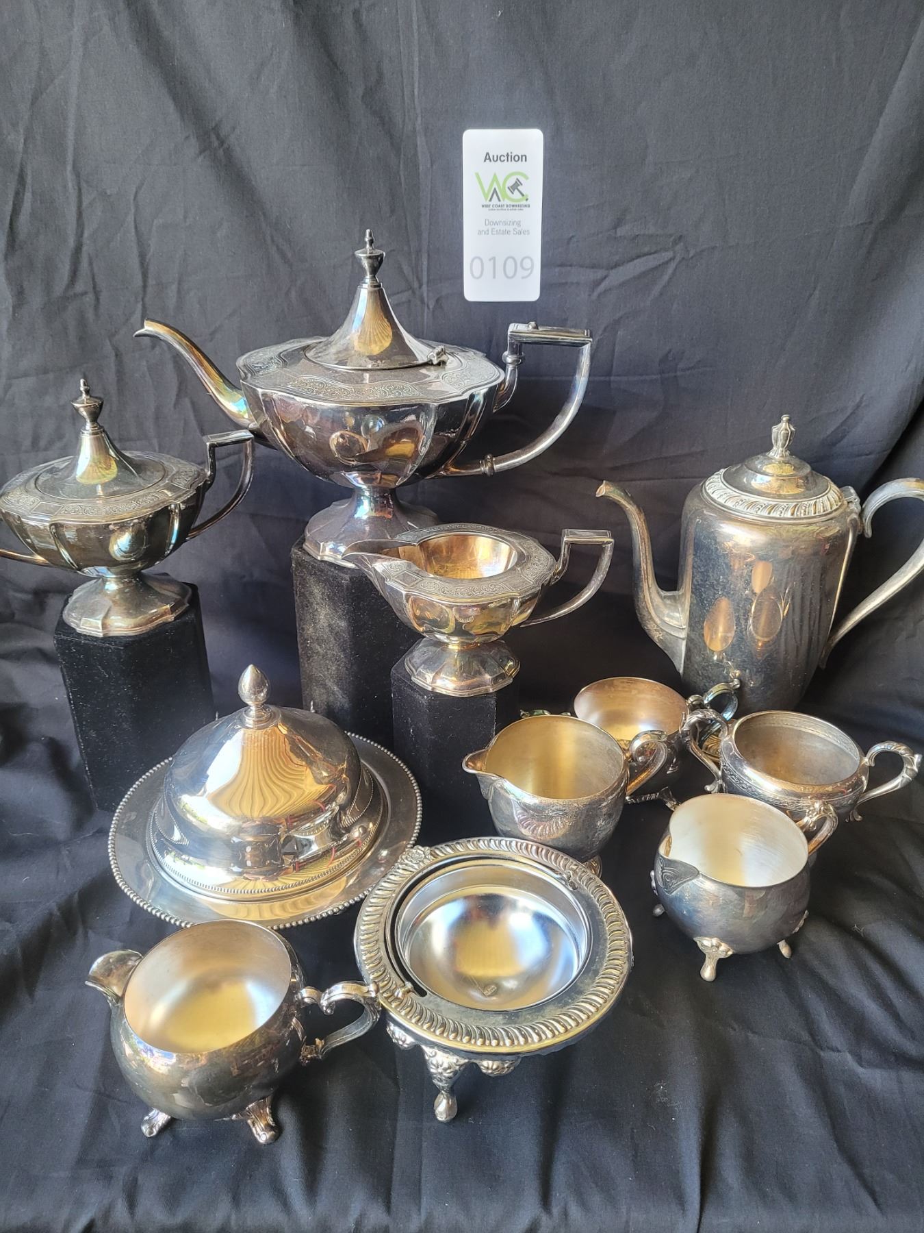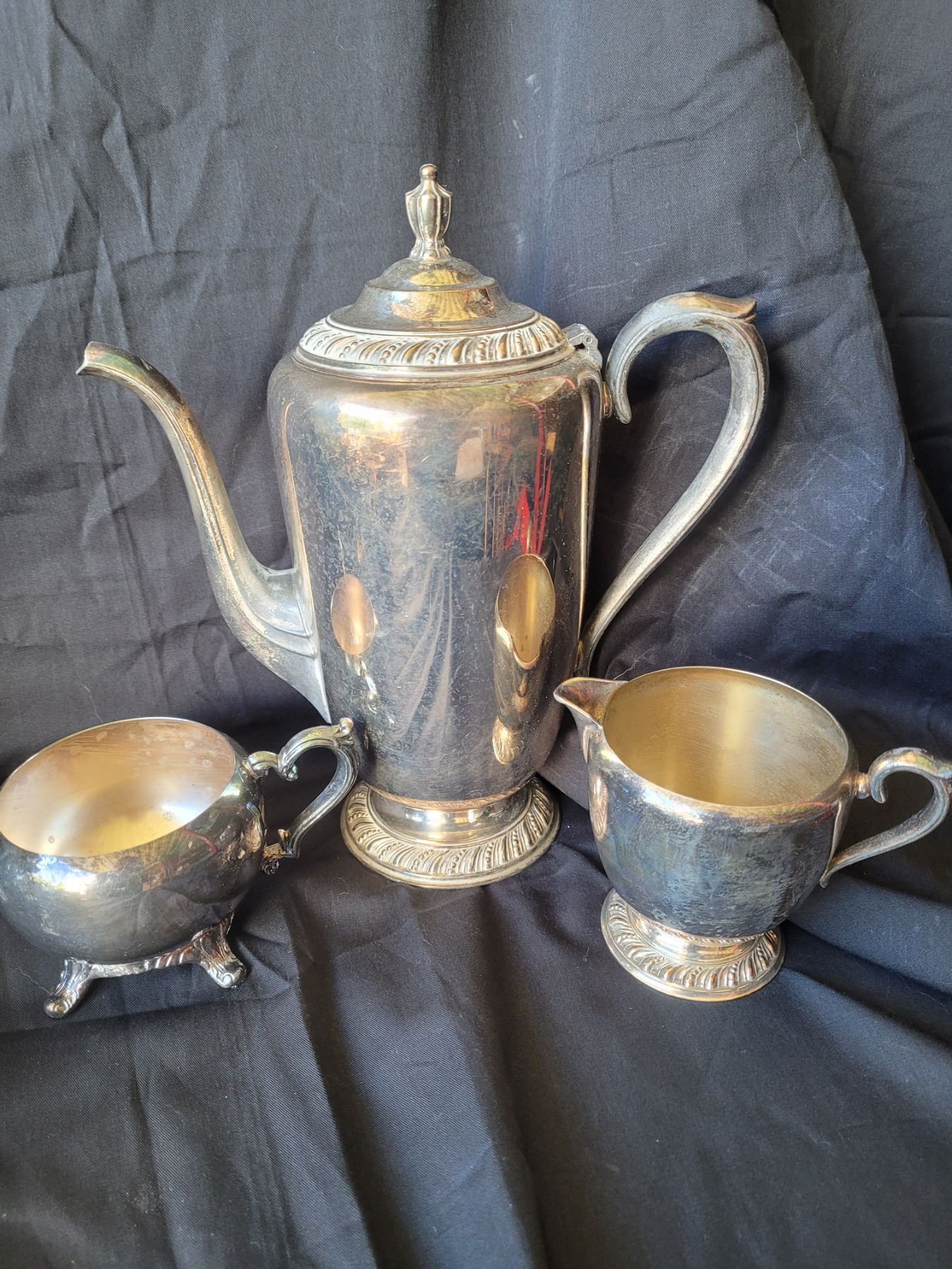 Silver Plated matching Teapot, cream & sugar, note that the teapot lid needs to be resoldered on. Coffee pot, cream and sugars, lidded butter and one chrome butter dish. Pickup at 9 am