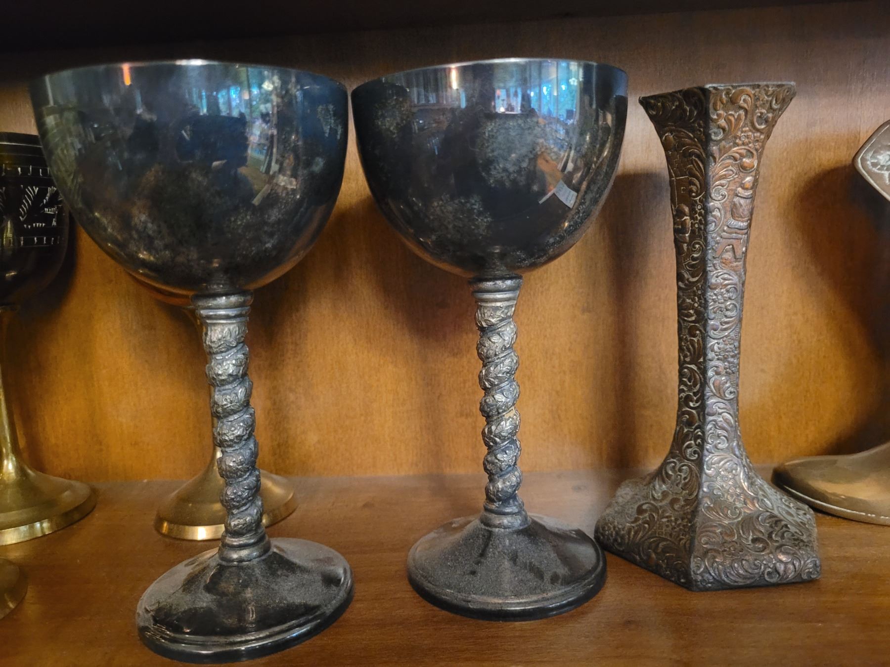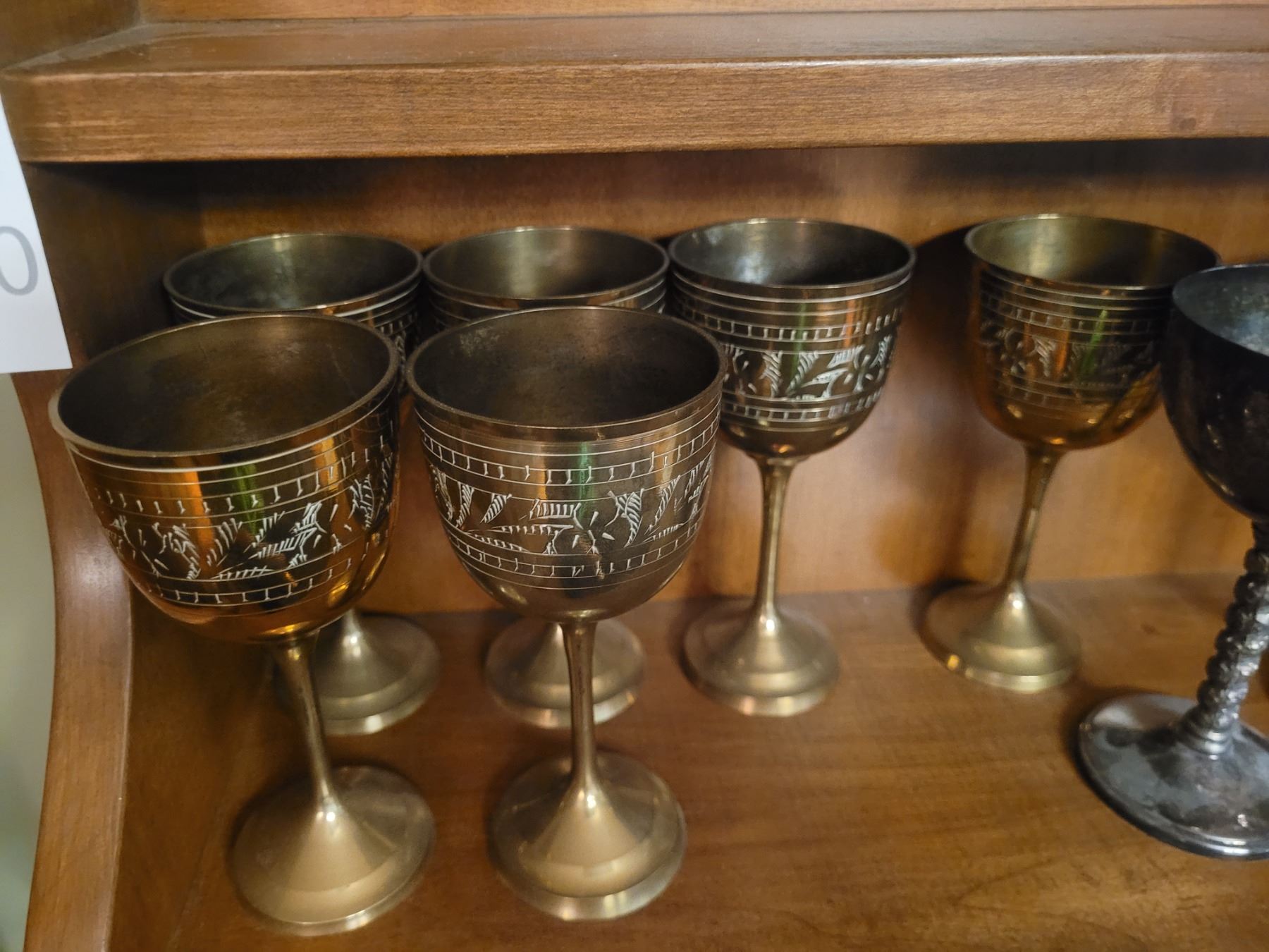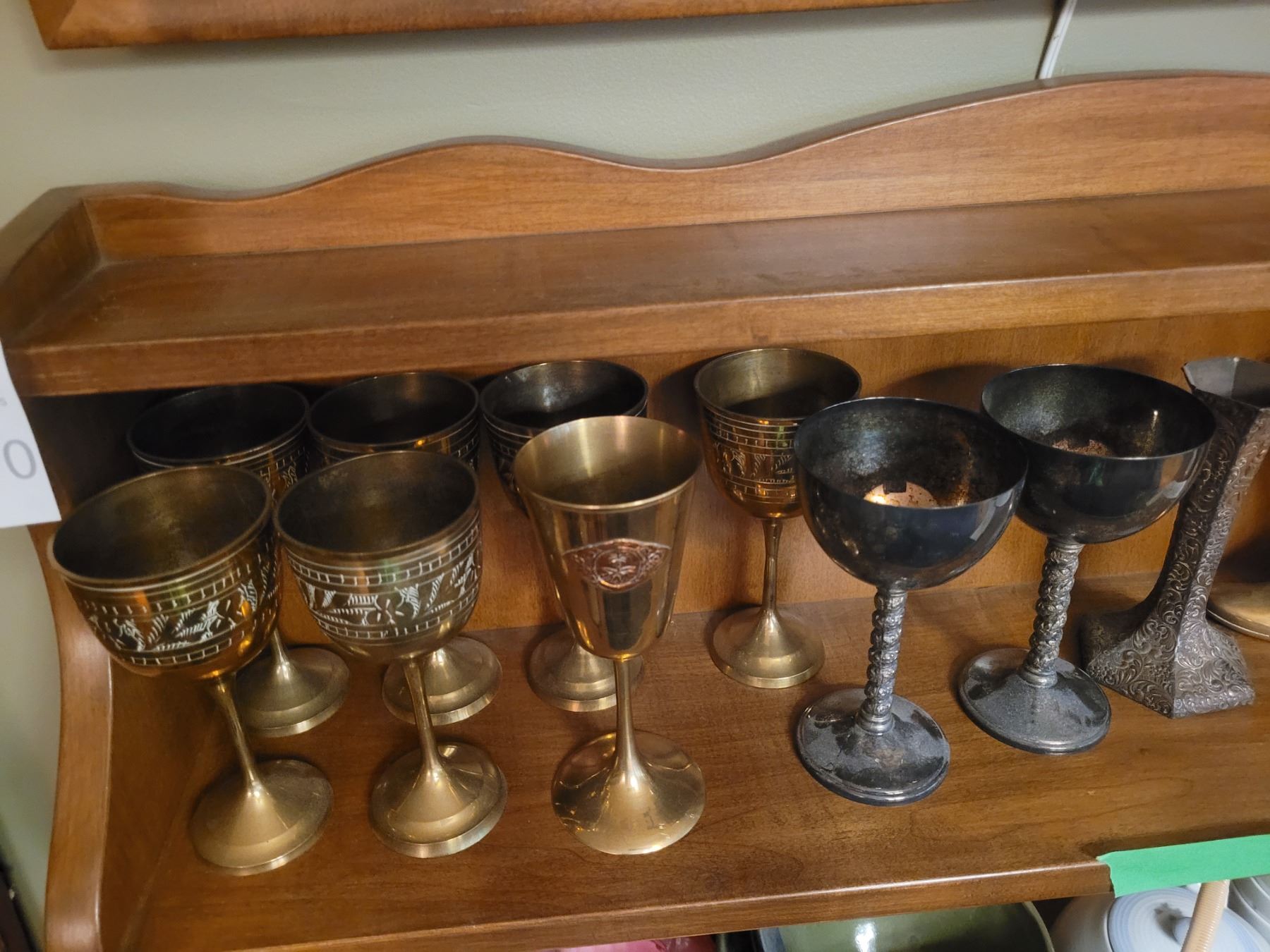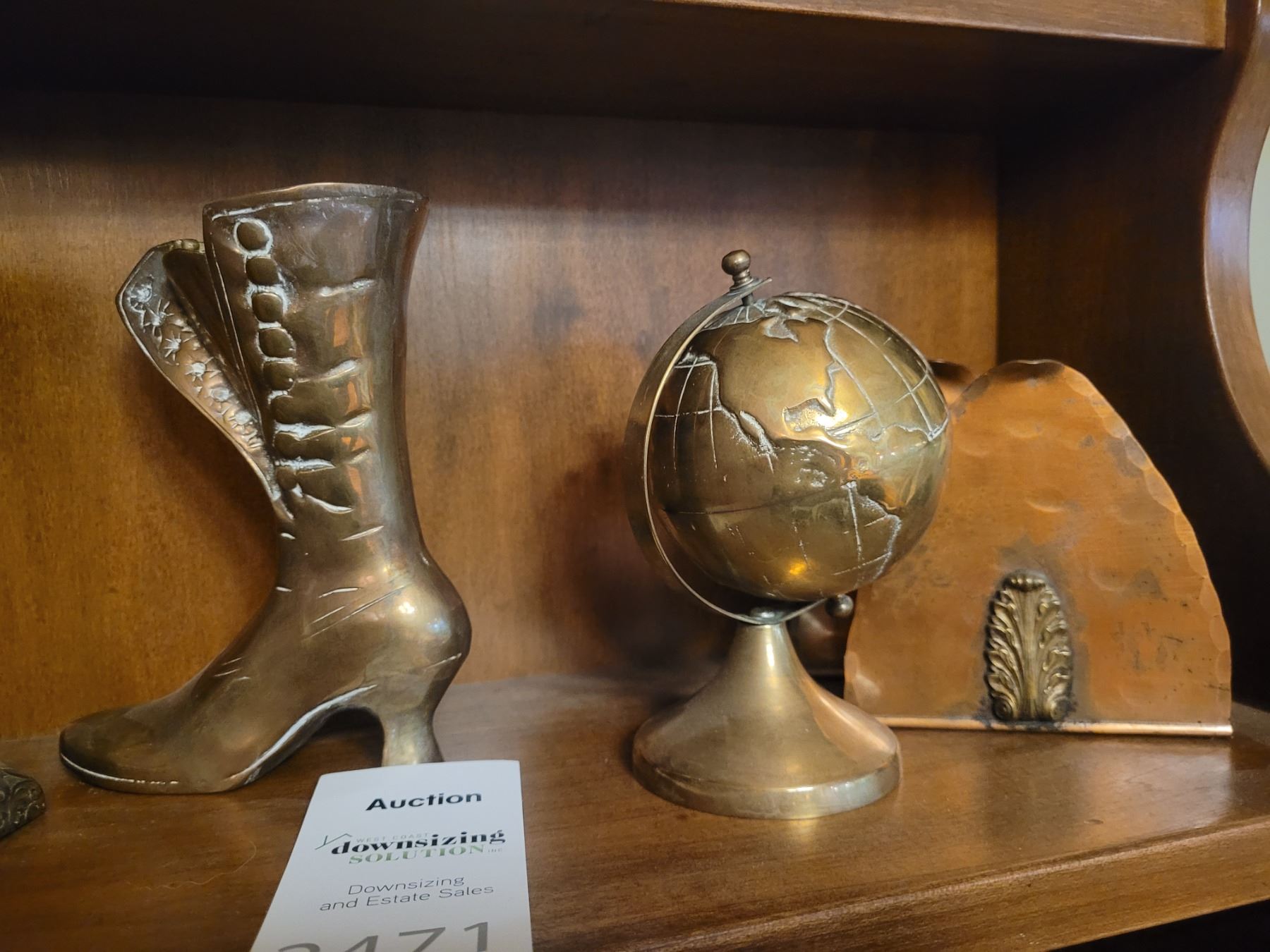 Collection of brass,silver plate copper, metal goblets, brass boot, atlas, more. Pick up 9-10
