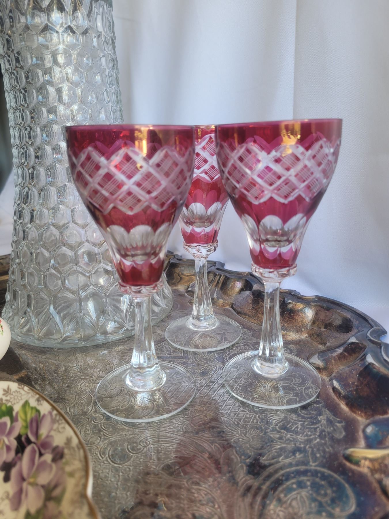 27x18" silver plated serving tray. Glass & Silver plate pitcher, 3 ruby glass goblets, lustre perfume bottle by Nancy Sexton. James Kent dish and painted egg. Bring packing and pickup 9 am