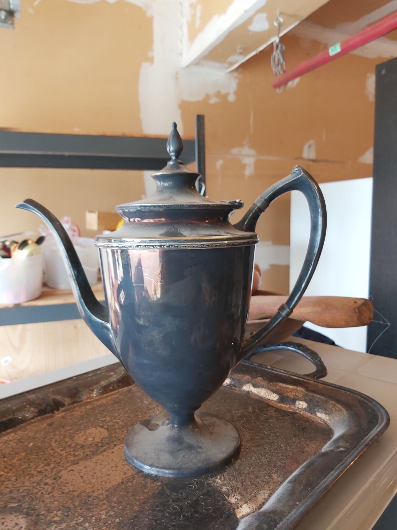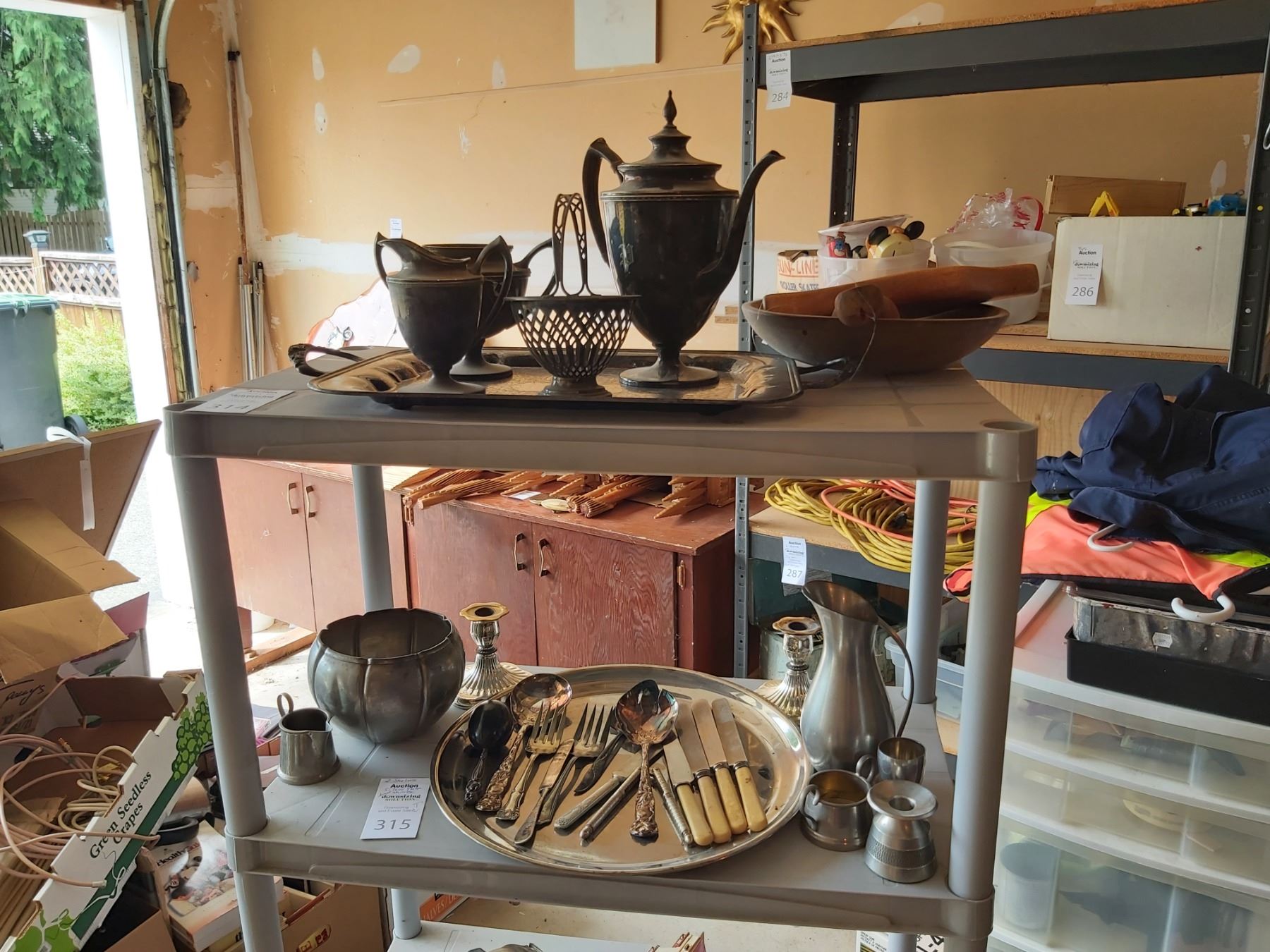 2 shelves of Silver plate, tea set on tray, silver, knives, forks, spoons, bowls, creamer, tray, and more included. Pickup 9 am cat. A.