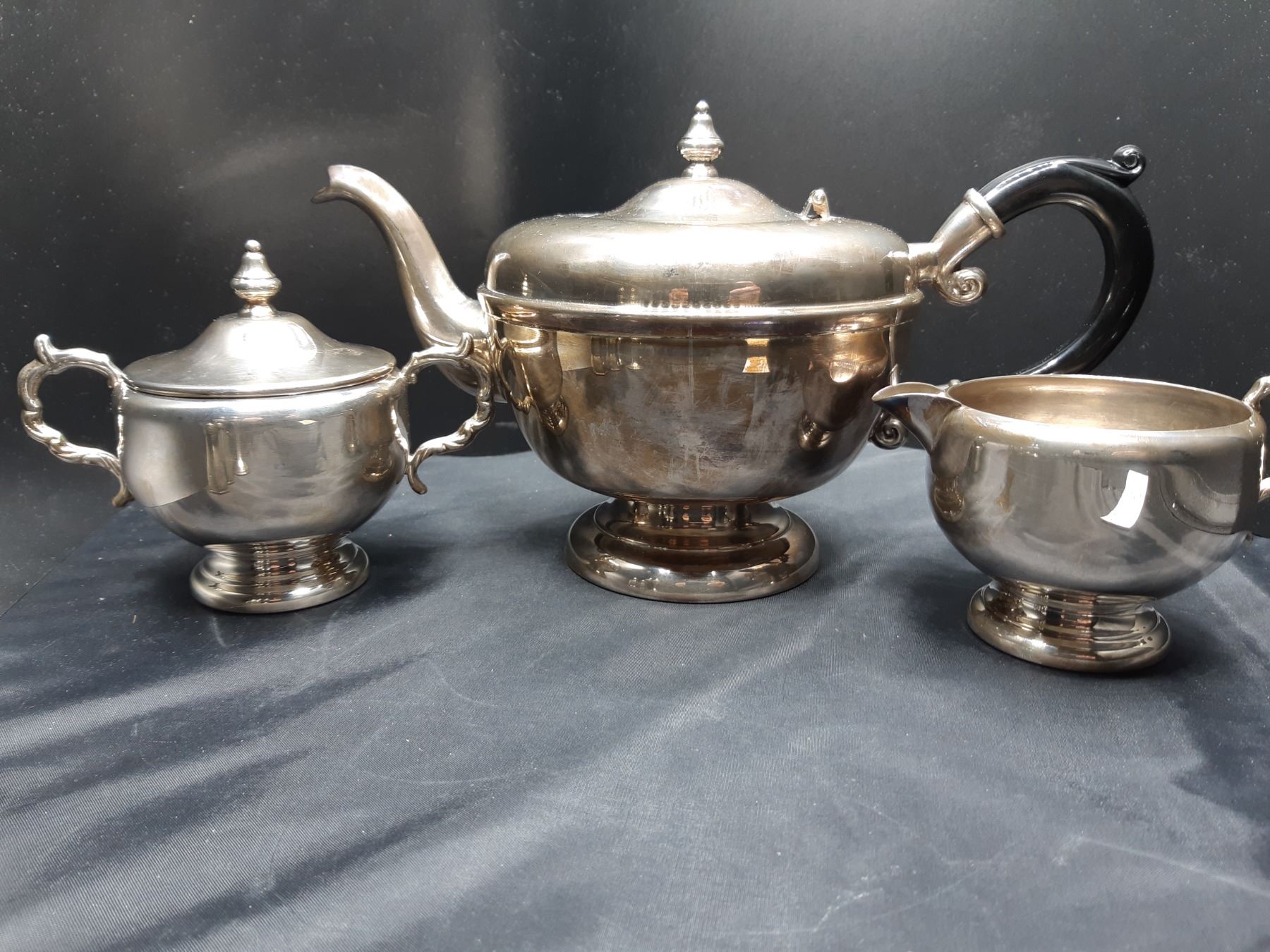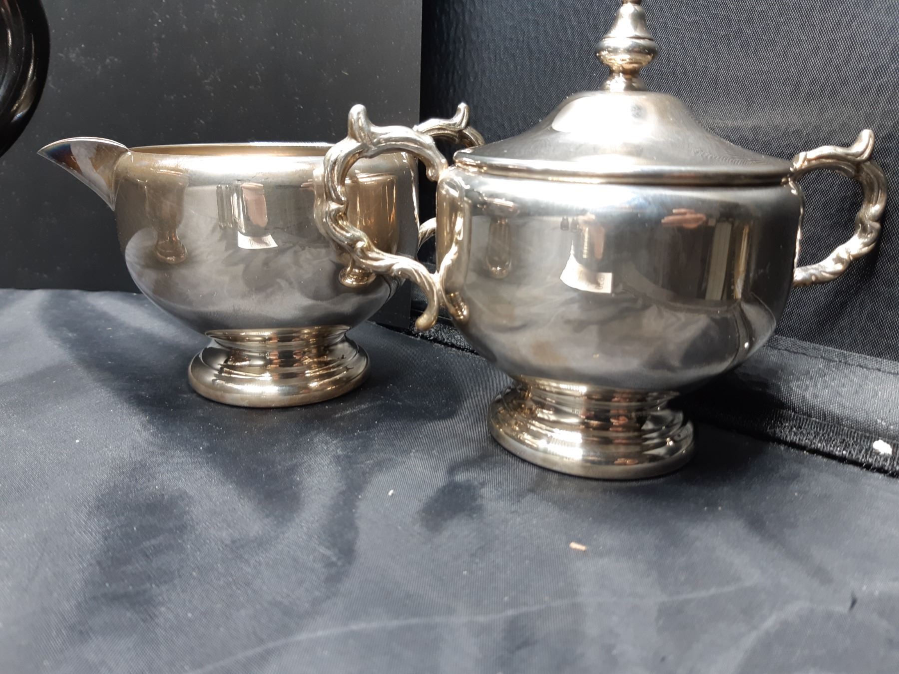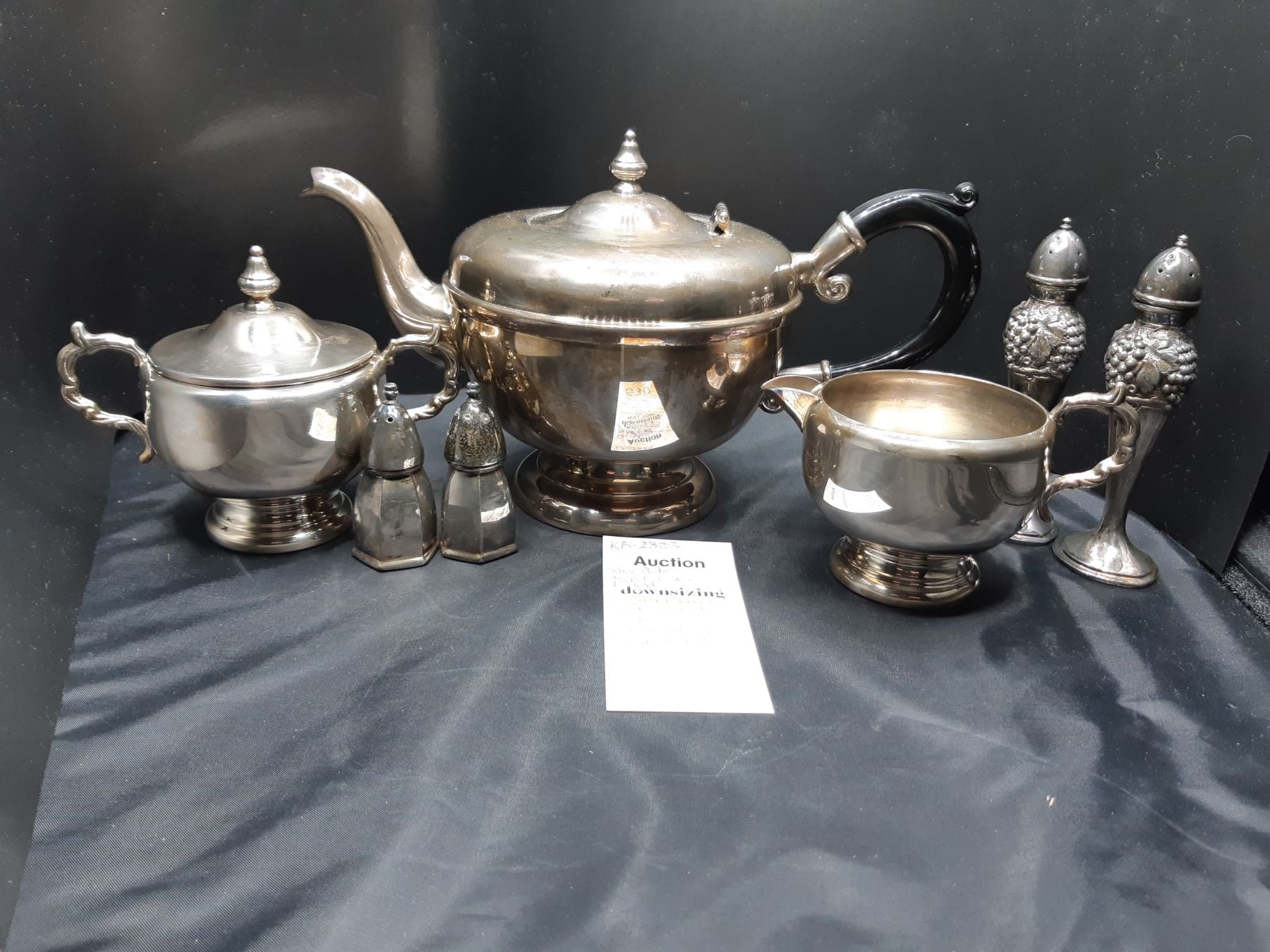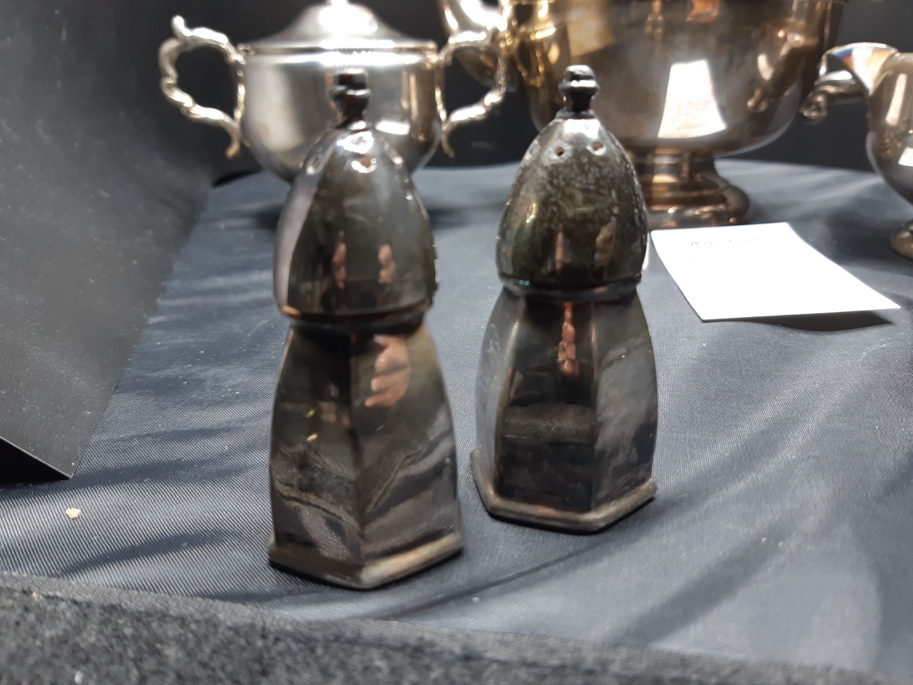 Silver plated teapot, lidded sugar & creamer. 2 sets of Silverplated S&P shakers. Bring packing material and pickup at 9 am