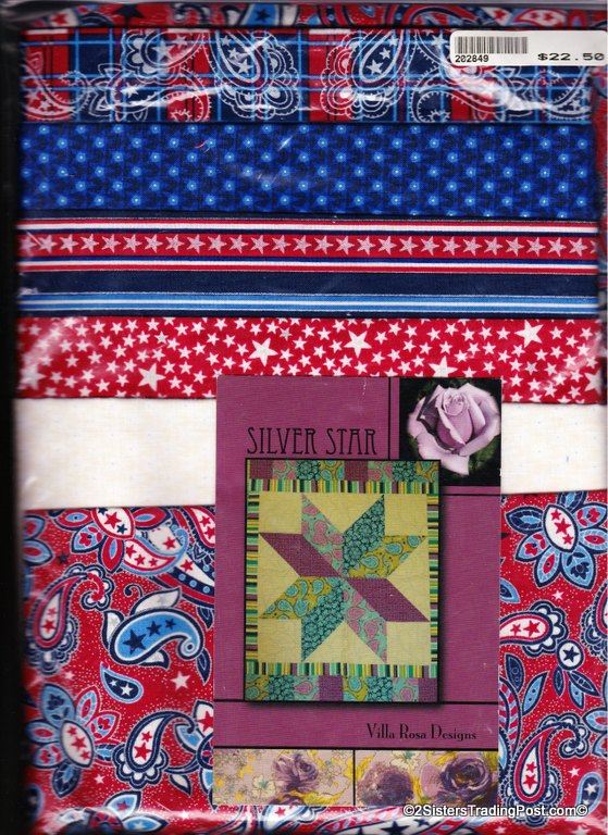 Pattern for 'Silver Star' from Villa Rosa Designs. Requires 6 fat quarters included in patriotic colors and prints by Kensington Studio for Quilting Treasures. NOTE: batting and 0.5 yard of backing fabric NOT included. MSRP $2.00 for the pattern and $22.50 for the 6 FQ