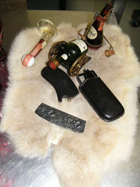 Silver comb, pair of old eyeglasses, magnifying glass, rabbit skin and collector bottles (189)