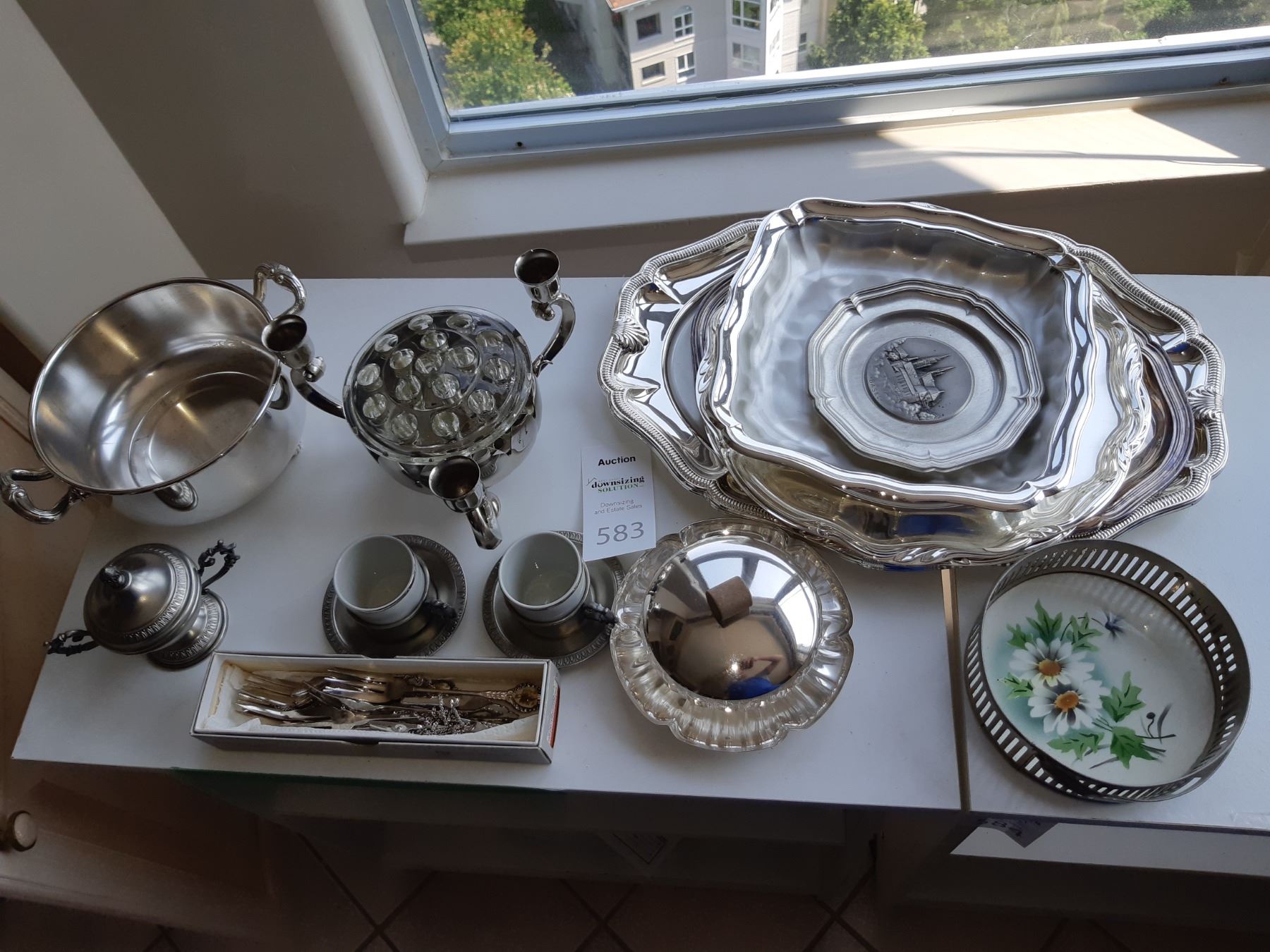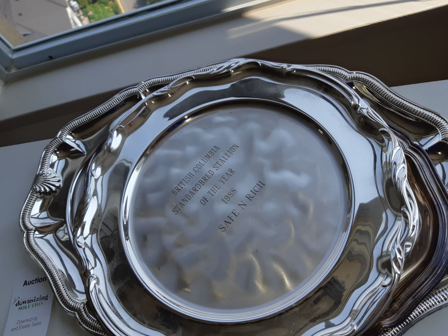 Assortment of silver plated bowl, rose & candle bowl. Trays are from horse winners. Pickup at 9 am