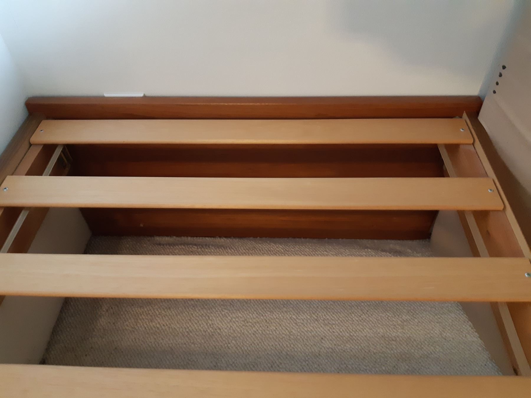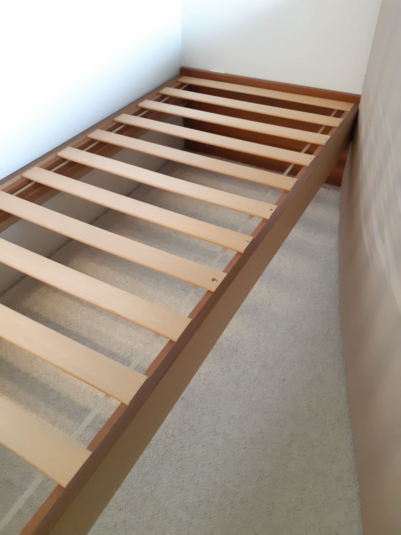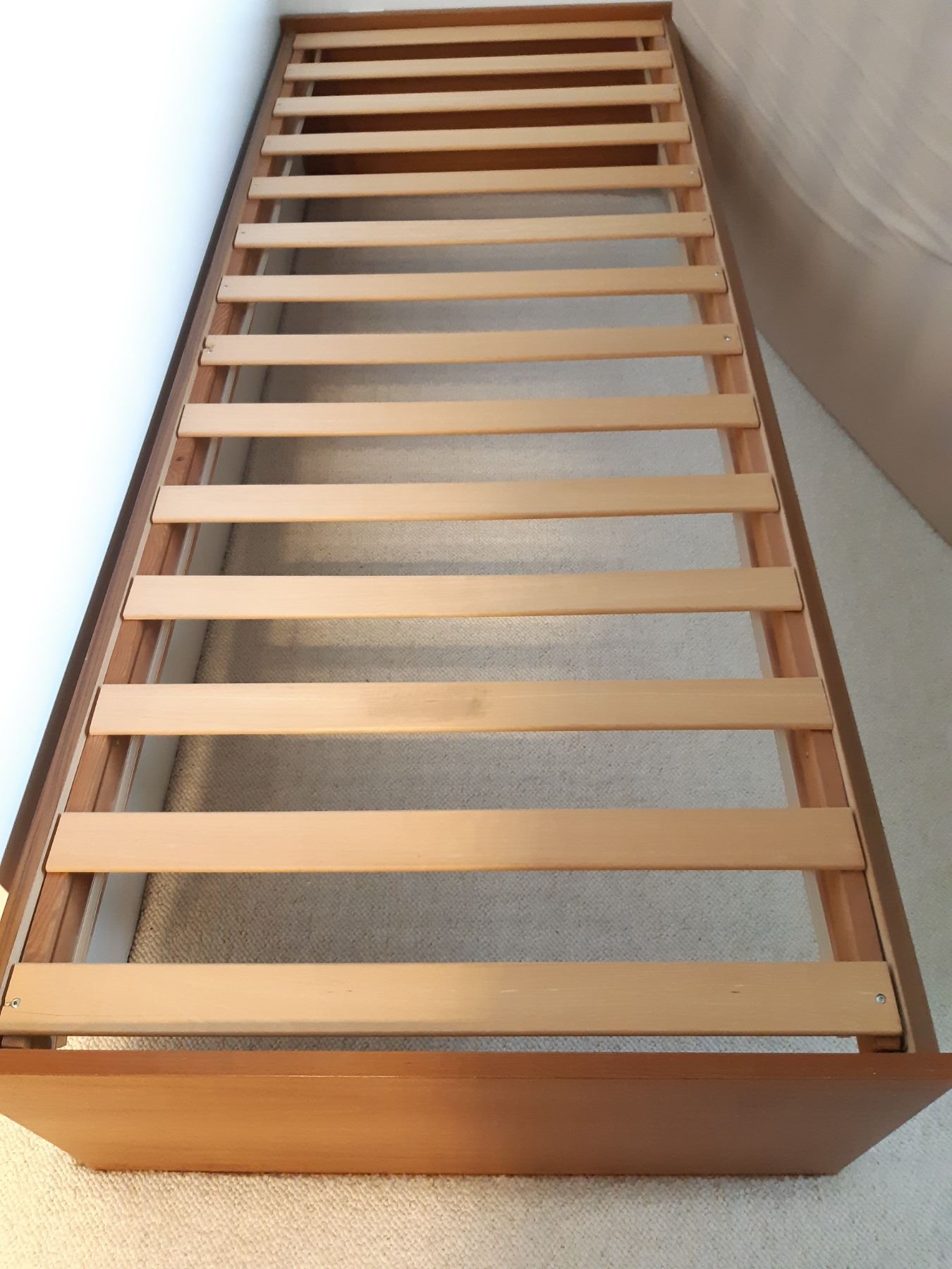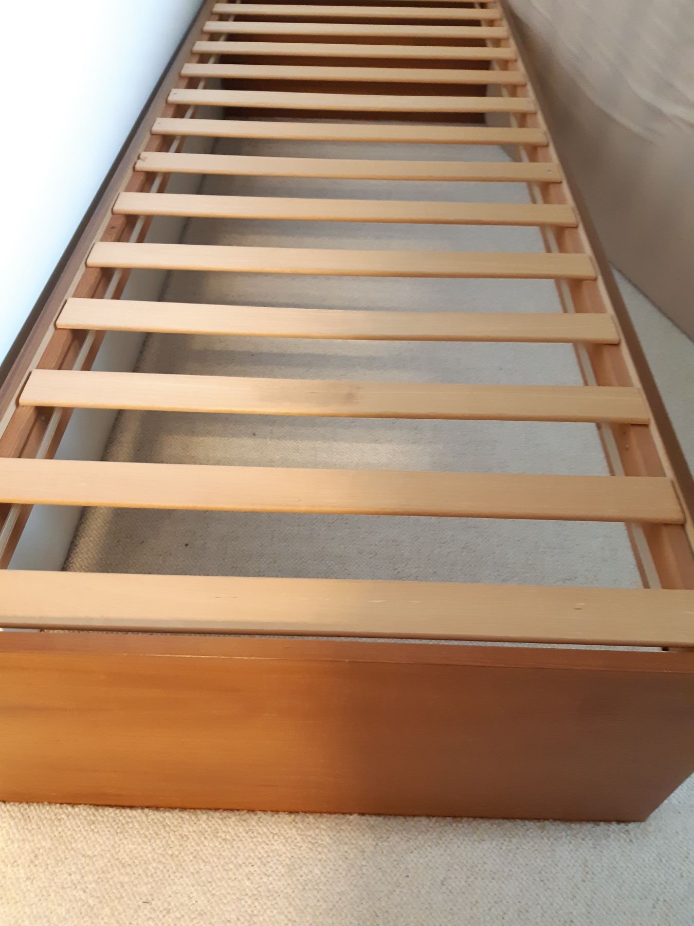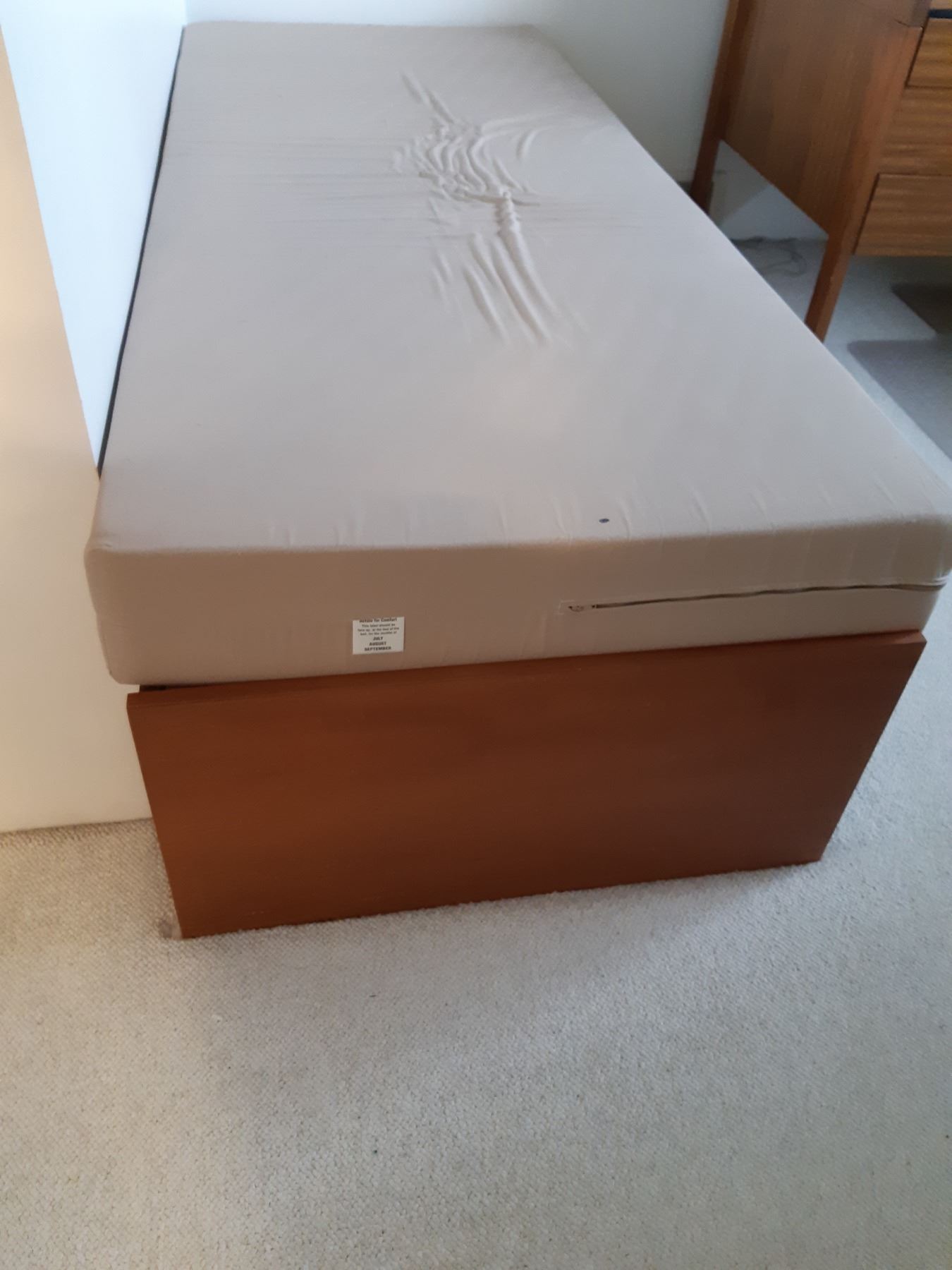 Teak single bed, 75x29x20, with foam mattress. Pickup at 11 am.