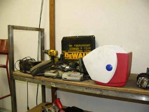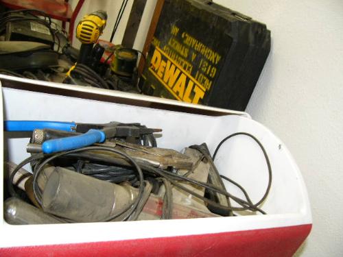 Skill Saws, Grinders, DeWalt Portable Drill, 14.4Volt Hand sander, battery charger, trouble light, disc sander, Electrical tester, and a small ice chest (169)
