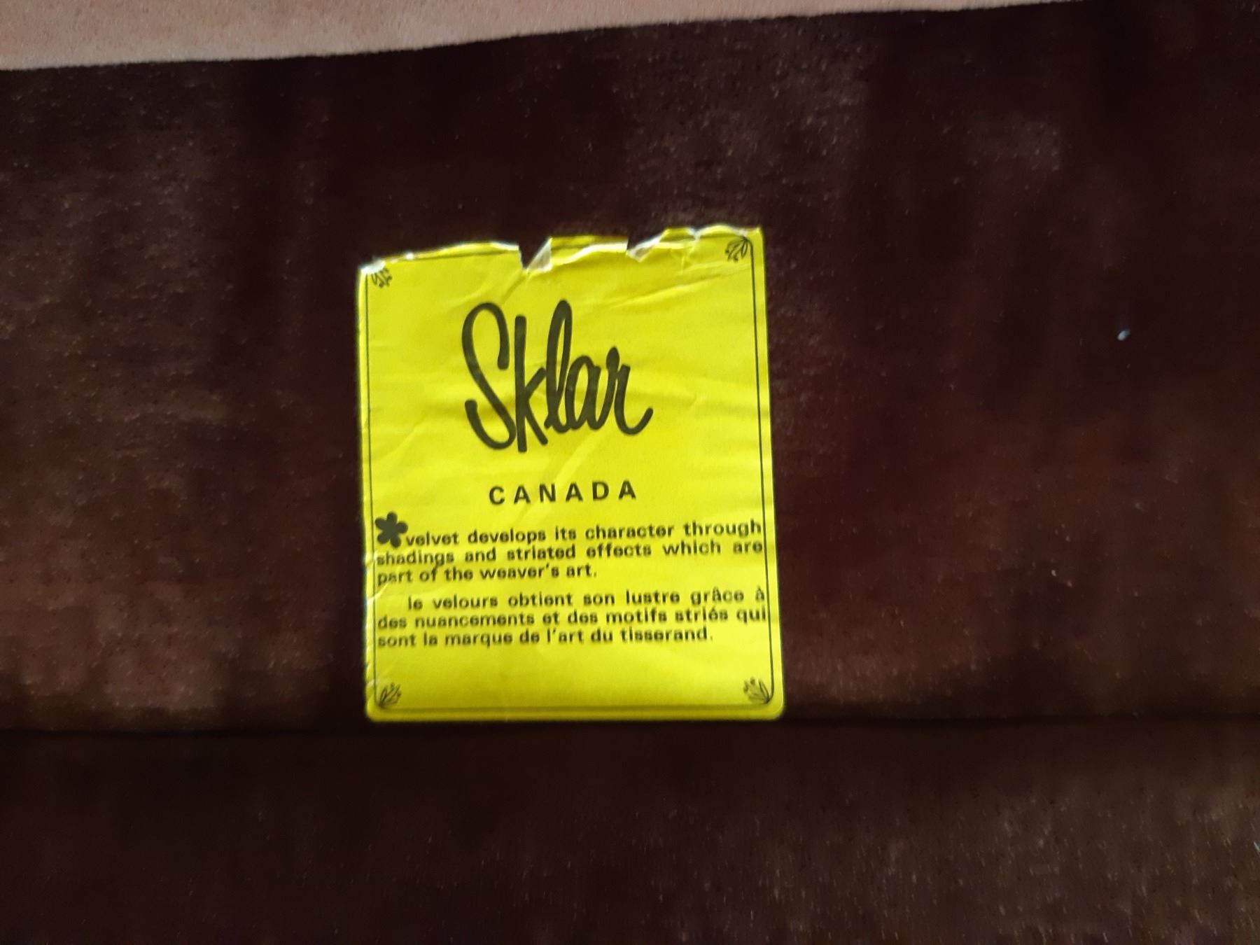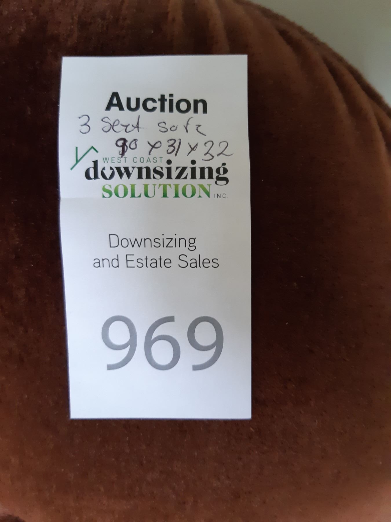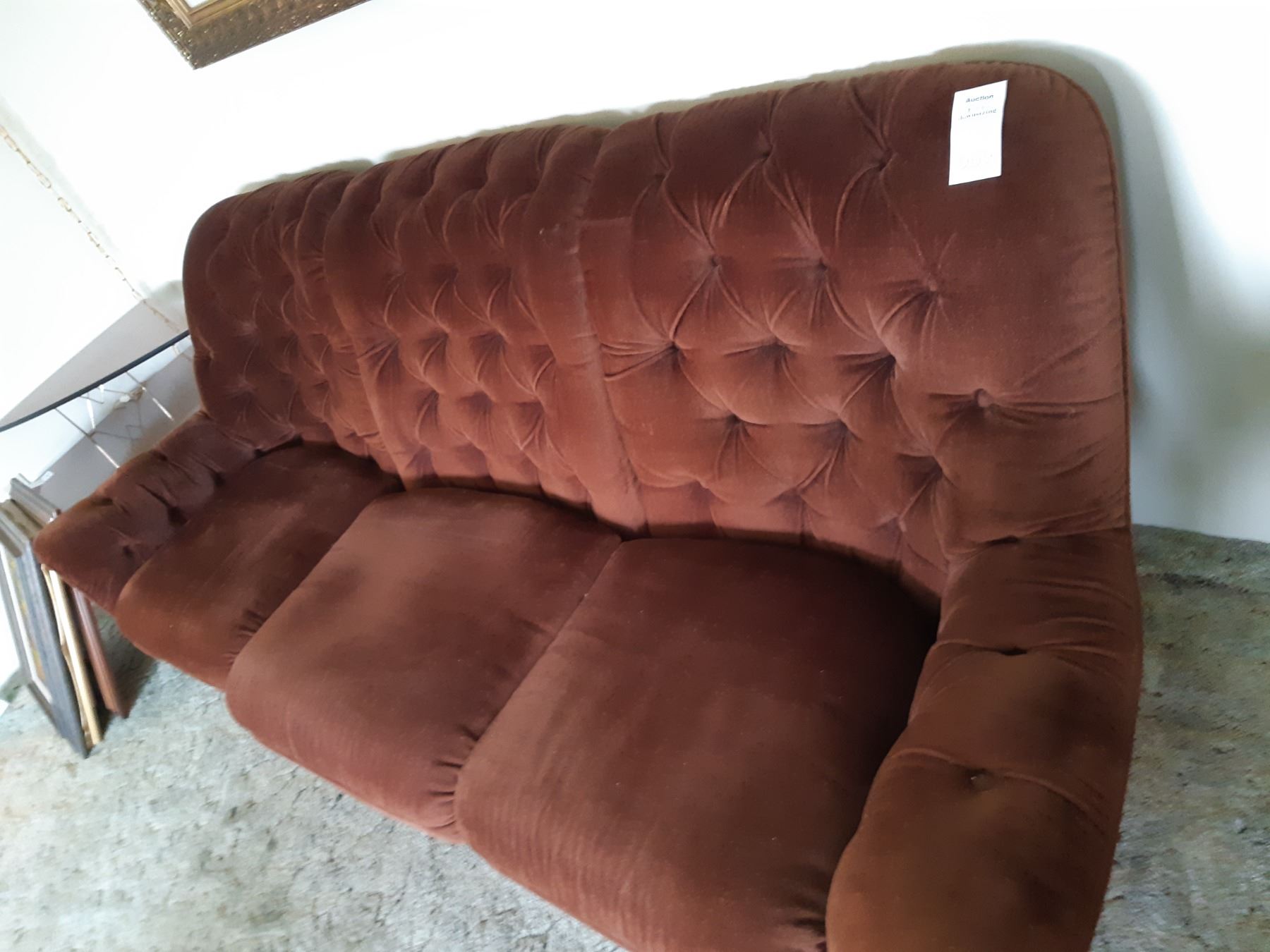3 seater sofa in brown velvety material with button back. 90x31x32. Bring help to move and pick up at 11am