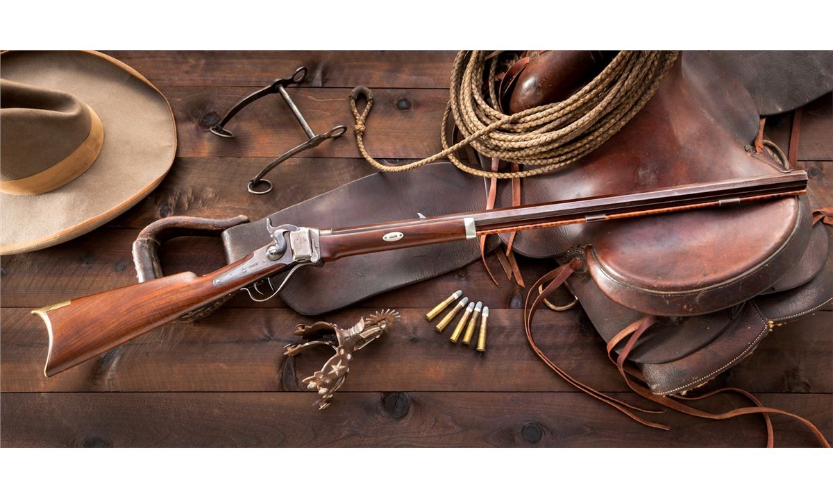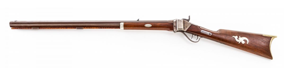 Rare and Desirable H. Slotterbek Model 1874 Sharps Sporting Rifle, #C,45392, in scarce .38 cal., 30'' brown octagonal barrel marked ''H. Slotterbek, Los Angeles'' in gabled manner. Case hardened frame, smooth straight walnut stock made from military Carbine stock, with nickel silver decorative plaque marked ''J.W. Wolfskill from his Father'', double set triggers, fine notched windage adjustable rear sight and what originally appears to be a Rocky Mountain type front sight where the base remains but the blade has gone missing. Typical Slotterbek wedding band detail to breech of barrel, with brass crescent buttplate. All appearing to be a very early example of a Slotterbek, Los Angeles, sporting rifle. William Wolfskill was instrumental in California ranch history, and was considered the founder of the California citrus industry, especially in the development of the Valencia orange. He sponsored the first public school in Los Angeles and was instrumental in the development of Southern California's cattle industry. In his 35-year residency, from 1831 to 1866, Wolfskill's role in transforming California from a sleepy Mexican province to the great state it later became, cannot be understated. A direct descendant of Daniel Boone, Wolfskill left Boone's Lick, MO, and took the Old Spanish Trail from Taos to Santa Fe to California. In less than 20 years, Wolfskill became perhaps the most successful grape and citrus producers in the state of California, owning what was at that time the largest wine vineyard in the state. It is interesting to note that Wolfskill's rancho encompasses todays Irvine, Santa Ana, and other Orange County communities. By 1866 James Irvine owned 100,000 acres in Orange County -- The county is named for Wolfskill's oranges. Condition of this rifle is excellent showing very light use and minor general thinning to finish. Stock is excellent with only slight pressure dings. Double set trigger functions as designed. Action is crisp, bore is excellent. A uniquely Southern California rifle from California' Golden Era. Est.: $18,000-$24,000. (Antique)