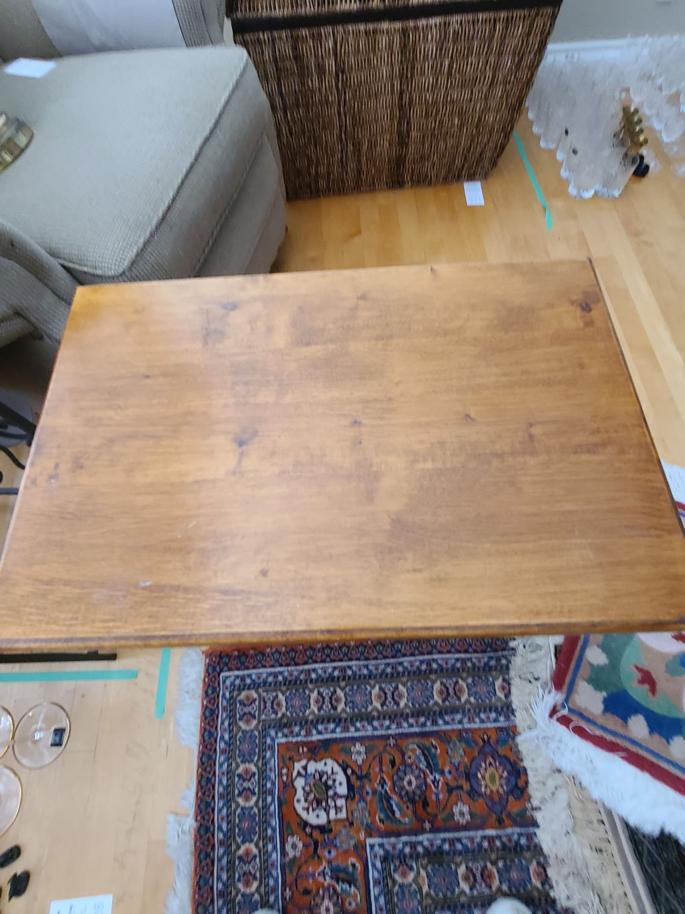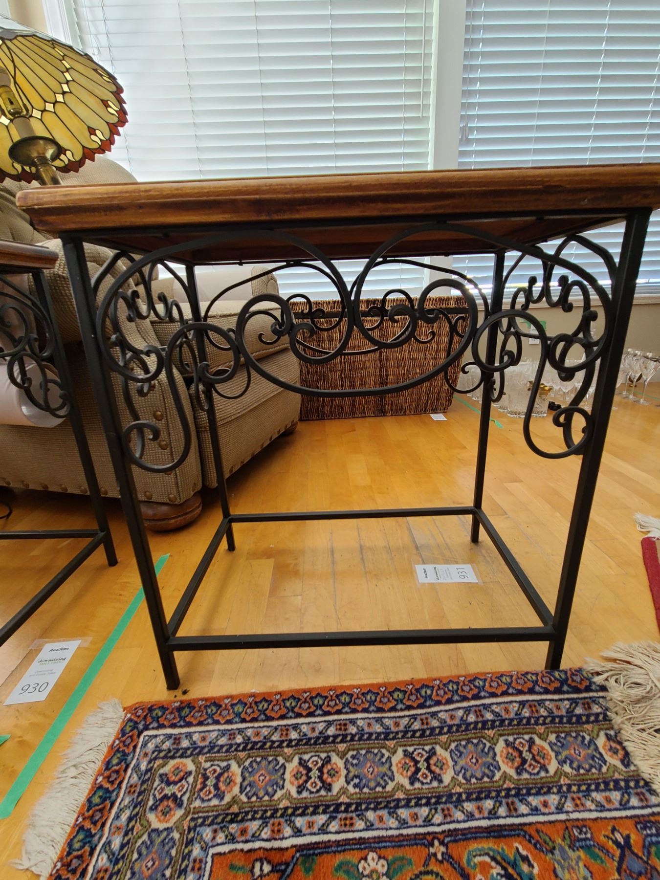 Small wood top table on metal frame, 21x14x23. Pickup 11 am.