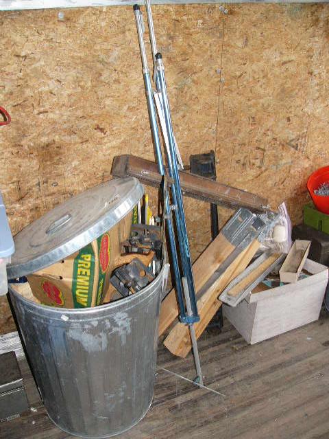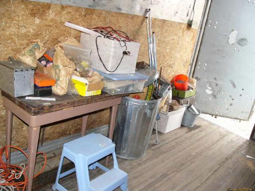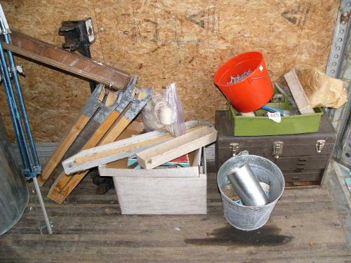 Small table; trash can; tool boxes; extension cords; tools; nails; saws; blue plastic step stool (81)