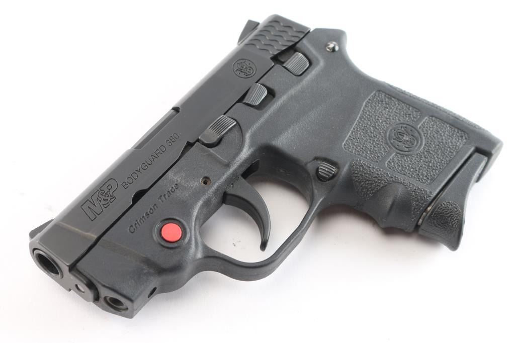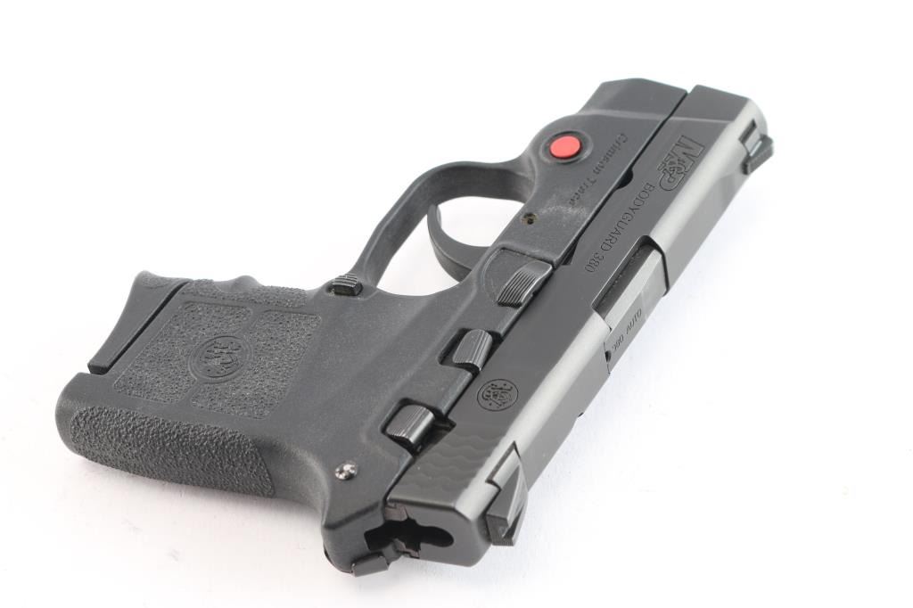 'BG380' Double-action-only semi-automatic sub-compact pistol chambered in .380 Auto. Features a black finished stainless steel slide, black finished stainless steel 2.75" barrel, dovetail mounted sights with serrated ramp front & square notch rear, integral Crimson Trace laser sight with ambidextrous controls, smooth curved trigger, concealed hammer, thumb safety on the left side of the frame, push button magazine release, factory 6 round magazine with finger rest floorplate, and black polymer frame with textured finger groove grip & installed pocket clip. Includes the original factory cardboard box with manual, lock, soft case, four spare magazines, and a Se Santis pocket holster. Pistol exhibits approximately 97% of its original finish showing light contact wear on the barrel hood and minor scratches. The action is mechanically sound, the bore is excellent and the polymer is very good with scuffs.