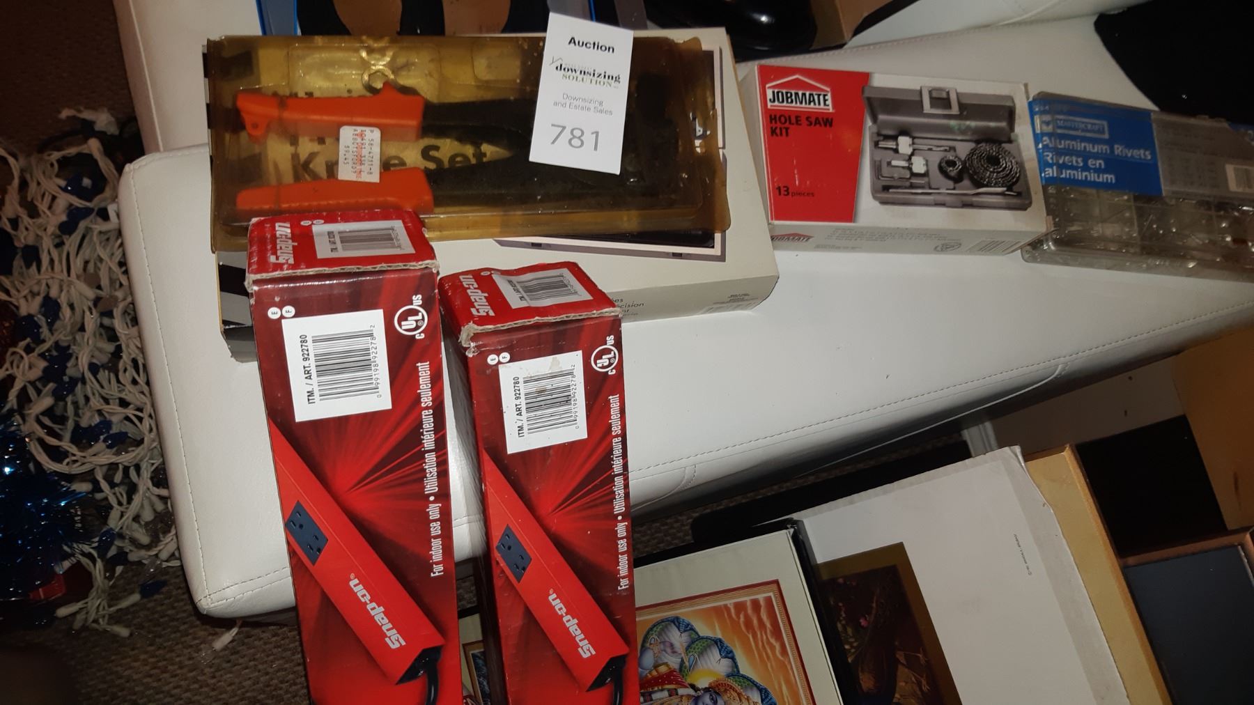 2 boxes of Snap-on 12 outlet power strip bars. Jobmate Hole Saw Kit, Pick up at 9am.