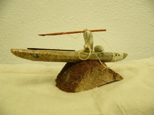 Soapstone kayaker mounted on whale bone base by Chuck- 3-1/2" tall and 7-3/4" long