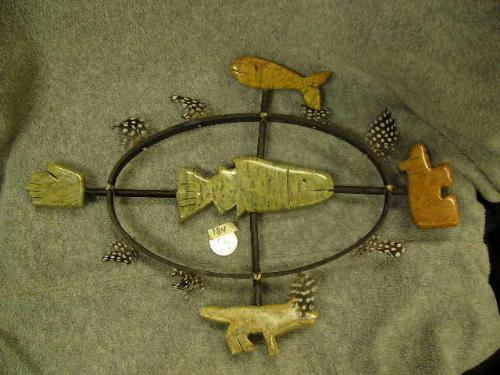 Soapstone salmon mask surrounded by soapstone whale, hand, bear, and wolf and also feathers by Inupiaq Eskimo Pearl Zoeblick from Nome, Alaska (2)