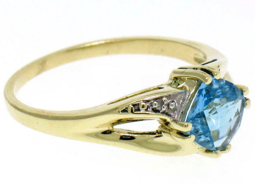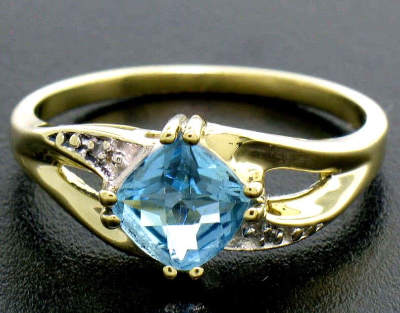 Solid 10k Yellow Gold Checkerboard Cushion Blue Topaz Ring w/ Diamond Accents. Please see photos and description for all available information. An estate solid 10k yellow gold solitaire ring, featuring 1 square cushion checkerboard cut natural topaz (6.1x6.0mm - 0.75ct), accented with 2 round brilliant cut natural diamonds (H- SI2; 0.02ctw). The ring is size 7.0, weighs a total of 2.7 grams, and measures 8.30mm wide.