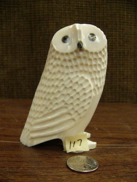 Solid ivory owl with baleen beak and inset baleen eyes by Hevic 4" tall (3)