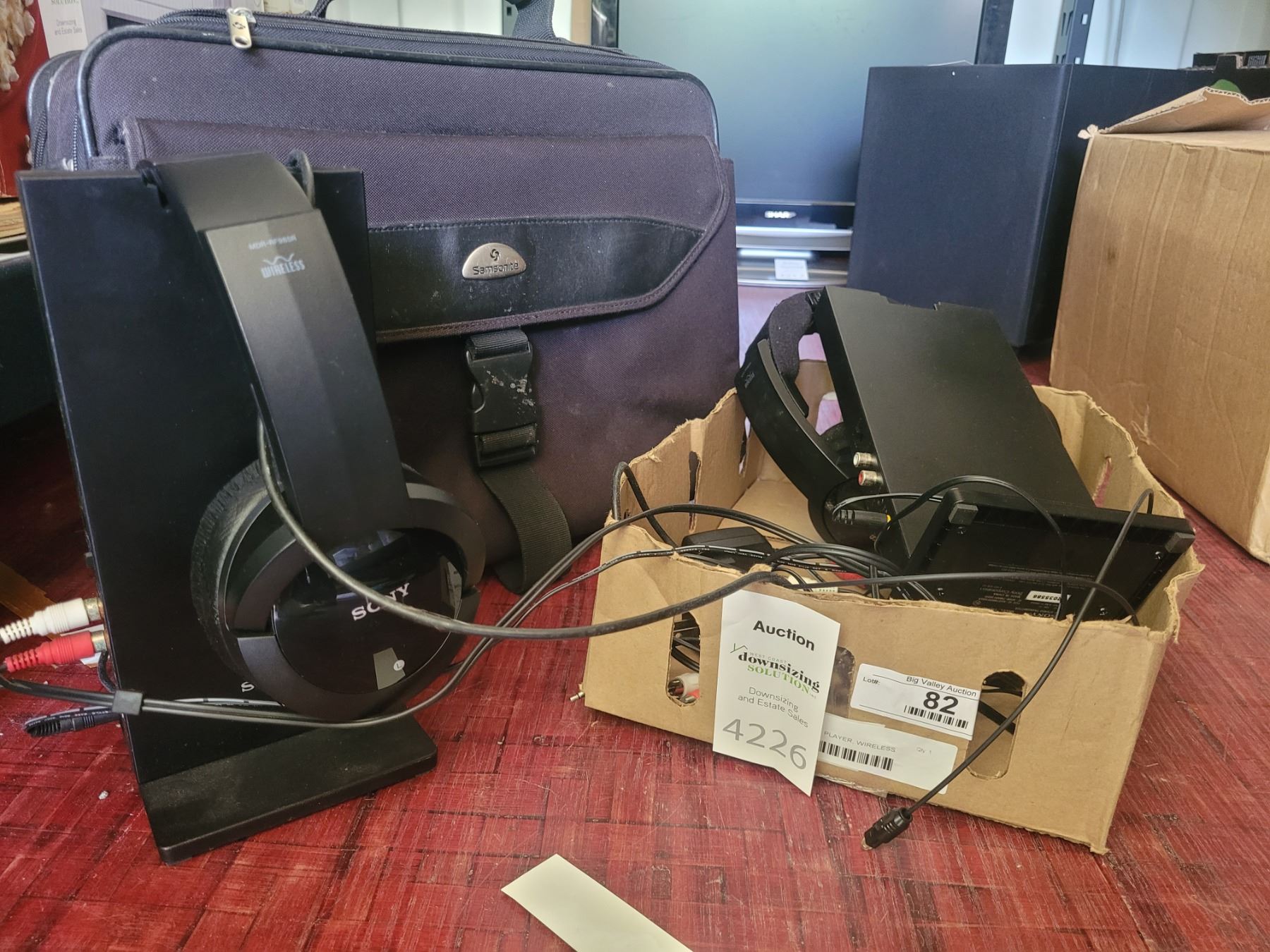 2 pairs of Wireless Headphones with towers RF985R, untested. Samsonite case. Pickup at 10 am