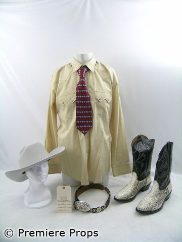 Floyd's creamy yellow cotton "Larry Mahan" l/s snap front western style shirt (size XL), maroon w/ blue and silver star and Texas shaped stripes "RM Style" neck tie, white python w/ black leather upper "Justin" cowboy boots (size 13), brown embossed leather w/ large oval silver designed buckle "Silver Creek" belt, grey felt "Stetson" cowboy hat (includes wardrobe tag / screen worn)