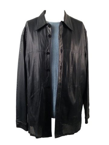 Soul Men (2008) - Floyd Henderson (Bernie Mac) screen worn, stunt double, navy perforated leather button down "Torras" jacket (lg), sky blue cashmere sweater from Neiman Marcus (xl) (inside tag attached reads "Stunt Floyd"). Wardrobe tag included.