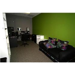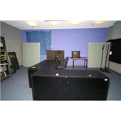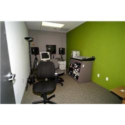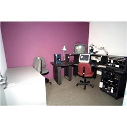 2 desks, chair, bookcase, mobile equipment rack, table, 4 lamps, misc. sound traps, fan - room 129