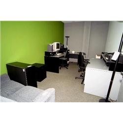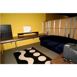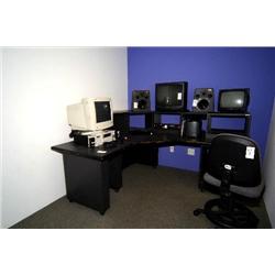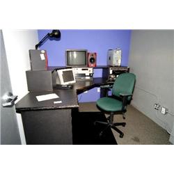 workstation with 52 point TRS patch bay w/ELCO back, chair, sofa, 2 bookcases, cabinet, table, lamp - room 153