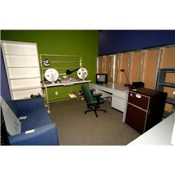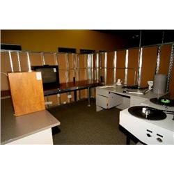 workstation with 92 point TT patch bay and Furman PL-Plus Power Conditioner, chair, 3 bookcases, cabinet with misc. - room 143
