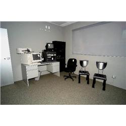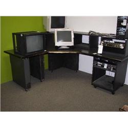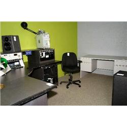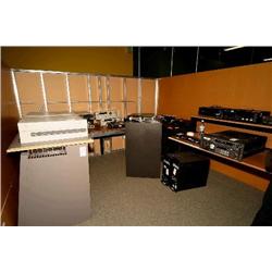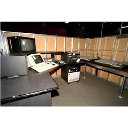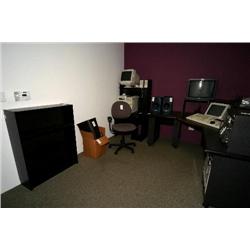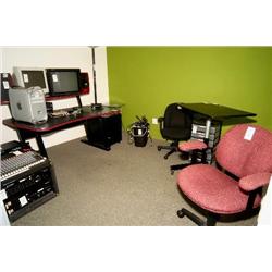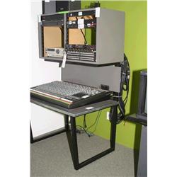 workstation with 52 point TRS patch bay w/ELCO back and Furman PL-Plus Power Conditioner, chair, desk, rolling cart - room 136