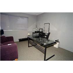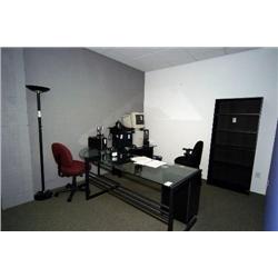 glass desk, chair, sofa, bookcase, 2 tables, 2 lamps, coat rack, file cabinet - room 167