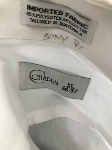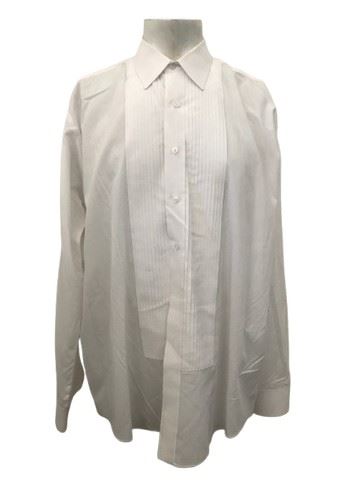 Southland Tales (2006) - Smallhouse’s (John Larroquette) screen worn, white tuxedo shirt. Size XL 36–37. Inside the collar reads Sony 71. Includes a costume department wardrobe tag.