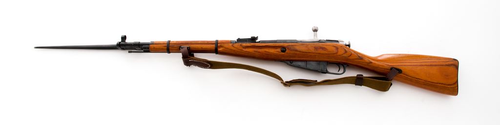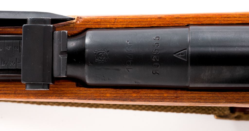 Soviet Izhevsk M44 Mosin-Nagant Bolt Action Carbine, with side folding bayonet, #02555, 7.62x54R cal., 20.5'' barrel, blued finish, laminate wood stock, hooded post front sight and adjustable tangent rear sight, cleaning rod, and correct type canvas sling with leather collars. Marked on top of chamber with Soviet crest and is dated ''1946'', with Izhevsk Arsenal maker's mark. Right side of buttstock near the buttplate is stamped ''TB-2-53-7''. Marked parts all appear to have the Izhevsk Arsenal stamp and externally numbered parts are matching. No visible import marks. Condition overall is very good with approx. 97% blued finish remaining on metal surfaces; some metal appears to have an arsenal refinish including the barrel shank. Wood with approx. 80% finish; upper portion of the wrist with a hairline crack in between two of the laminate pieces; overall the wood is solid. Action is smooth, bore is near excellent with some very minor frosting; rifling is sharp. Bayonet and sling are also excellent; bayonet operates smoothly. Est.: $200-$300. (C&R)