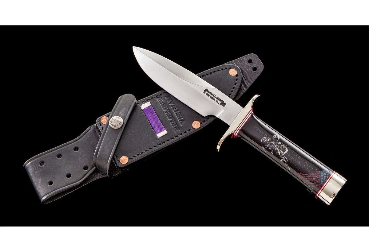 Special Order Randall ''Combat Companion'' Remember Vietnam Commemorative Knife, 5'' stainless steel blade is marked ''RANDALL MADE/ORLANDO, FL.'' with an ''S'' outside the logo. The overall length is 9-1/2''. Smooth black buffalo horn handle scrimshawed on both sides by E. Fray. The front side depicts the Vietnam Veteran Memorial Wall. The opposite side says ''Remember Vietnam'' with a ''Combat Nurses Logo.'' Red and stainless spacers, nickel silver full guard and pommel. Sullivan sheath stamped with the ''Randall'' football-shaped logo and ''Sullivan'' logo on the back. The front has an inlaid purple heart ribbon bar, and is stamped ''REMEMBER VIETNAM,'' with copper rivets and a ''RANDALL MADE'' snap. Condition is fine, showing no use. Handle with two minor inclusions that detract little; handle also has three near imperceptible chips on the underside. All blemishes to the handle are not present on any of the scrimshawed areas. The sheath is excellent. Est.: $800-$1,200.